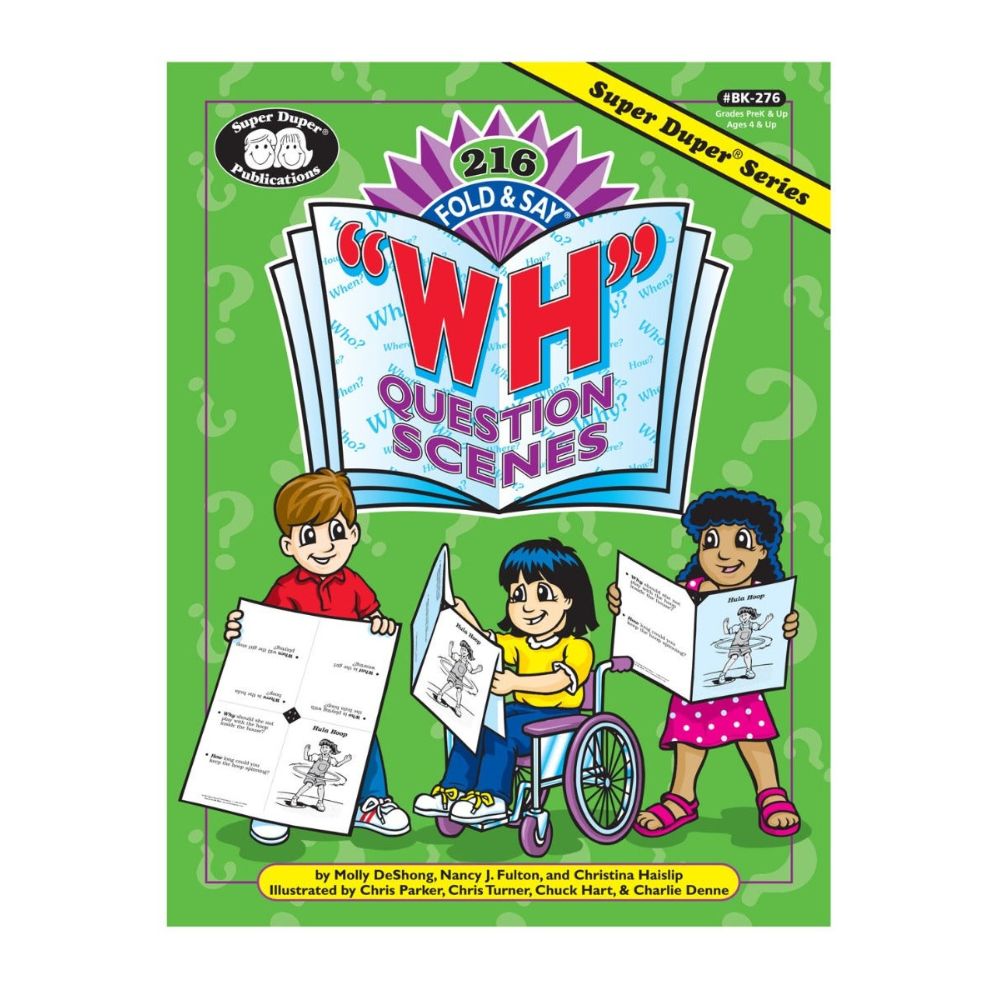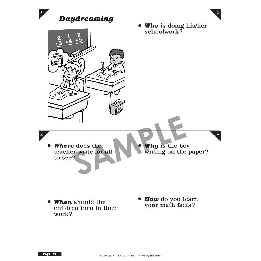Each reproducible page turns into a small, four-page booklet. The first page contains a scene. The next three pages have "Wh" questions about the scene, (Who, What, When, Where, Why). Your students practice their expressive and receptive language skills as they answer the questions (verbally or by writing). A bonus "How" question on each page offers an extra challenge!