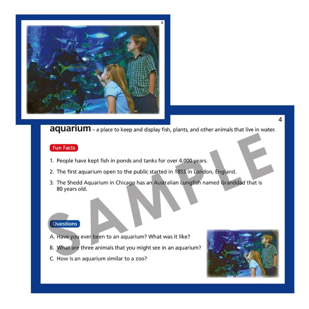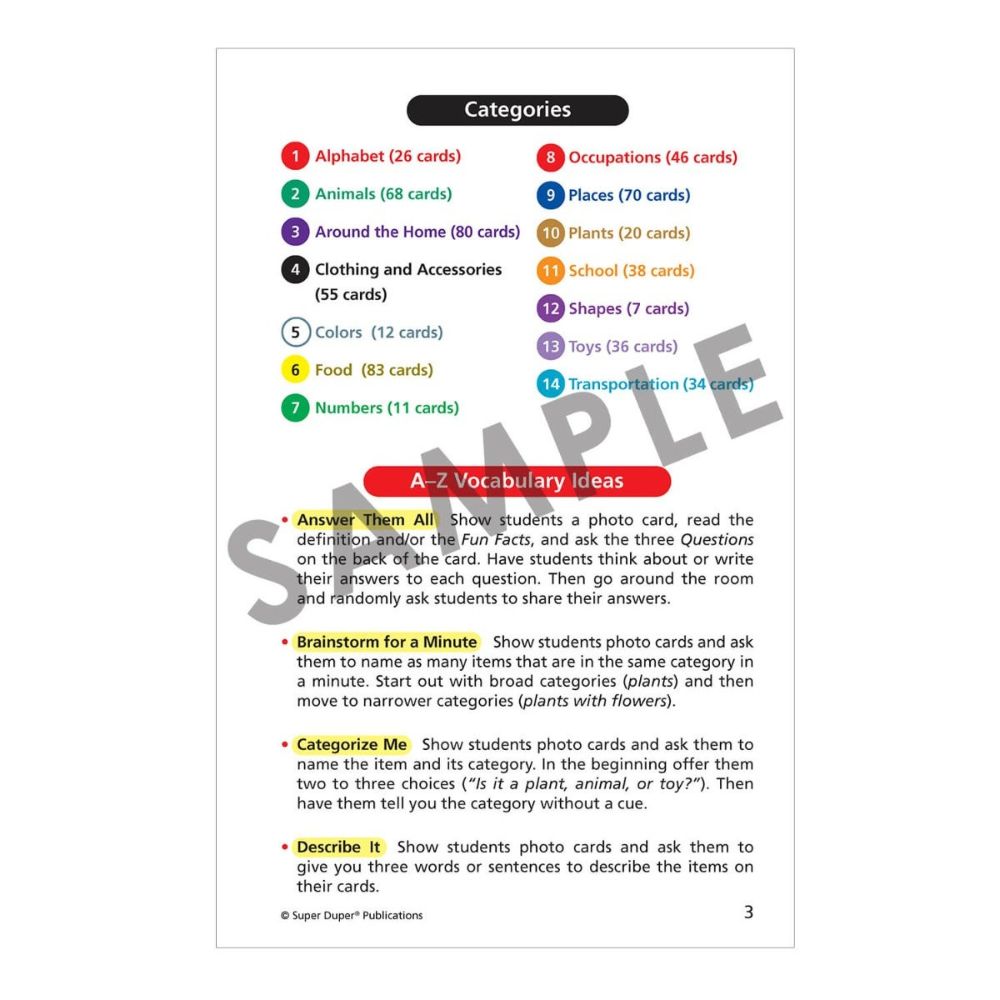 These durable, laminated cards are excellent for naming, describing, identifying attributes, comparing and contrasting, formulating sentences, and practicing conversation skills. The card front features an easy-to-identify photo with a white background. The back of the card presents the definition of the word, three Fun Facts, and three Questions. For Alphabet, Numbers, and Shapes there are photos that illustrate these concepts. The photo card deck includes written 26 A–Z Vocabulary Ideas, to inspire unlimited ways to teach new words!