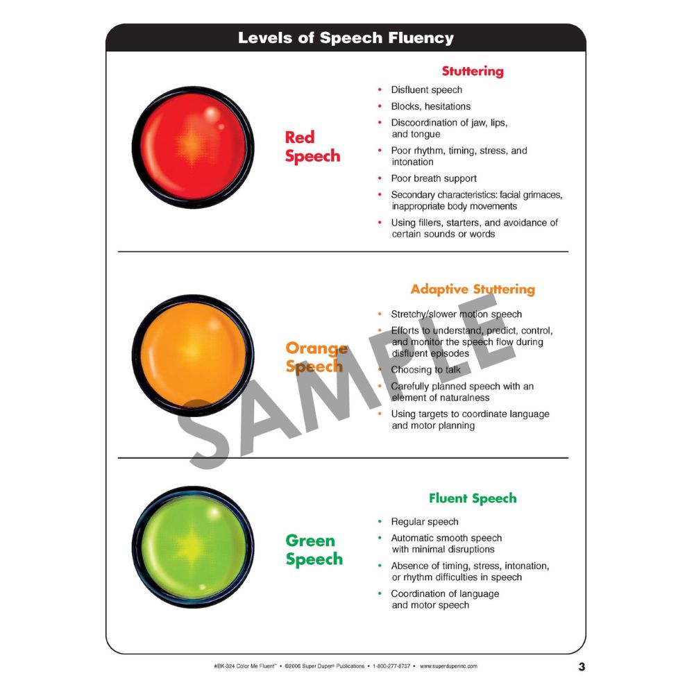 The Color Me Fluent® program promotes overlearning of correct and exaggerated speech patterns by focusing on breathing, phonation, articulation, and resonation. These strategies help the stutterer gain control of his/her speaking. The block management strategies in the program reduce fear and avoidance of speaking. This program also utilizes the power of colour to promote fluency and reduce the impact of stuttering. Levels of speech fluency represented in colours provide visual cues to the student regarding his/her speech.