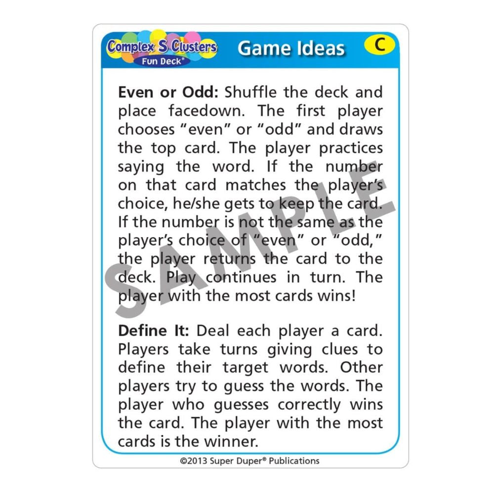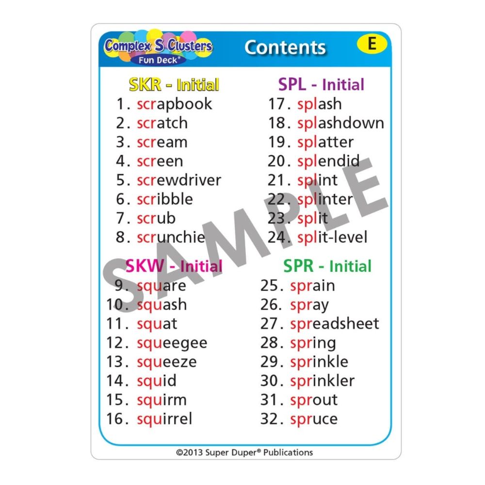 Complex S Clusters Fun Deck has 58 cards that challenge students to produce the S sound in three-consonant blends.