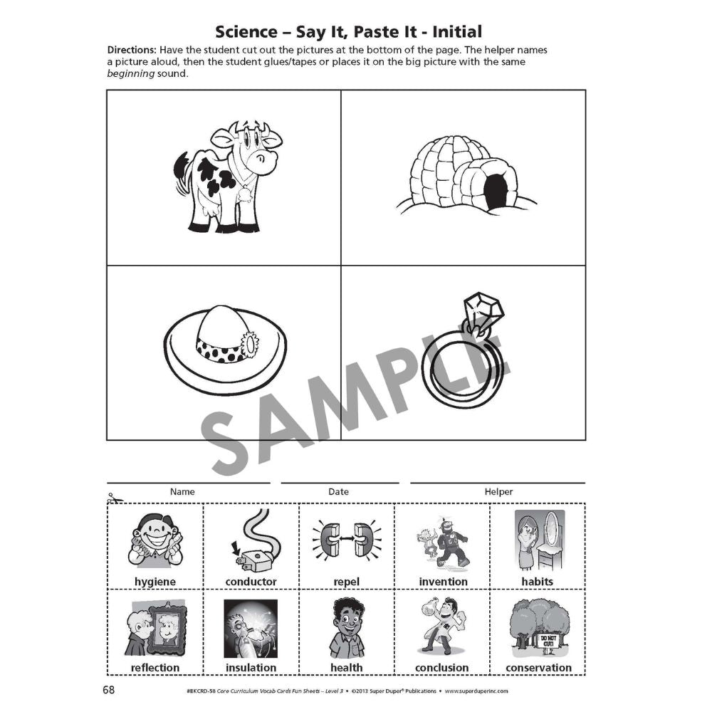 The Core Curriculum photo cards are ideal for the Speech-Language Pathologist (SLP), special educator, classroom teacher, or reading specialist. The workbook activities can be used independently or as a companion to the photo cards with a whole or small group, one-on-one during therapy sessions, for homework assignments, or as a simple assessment.