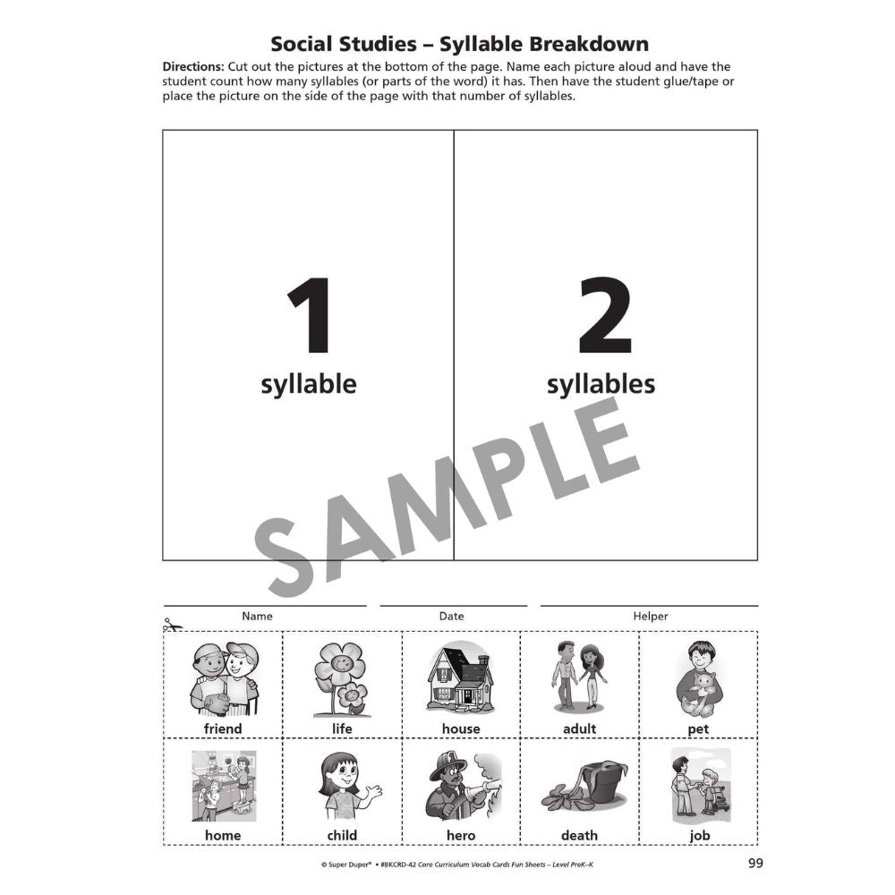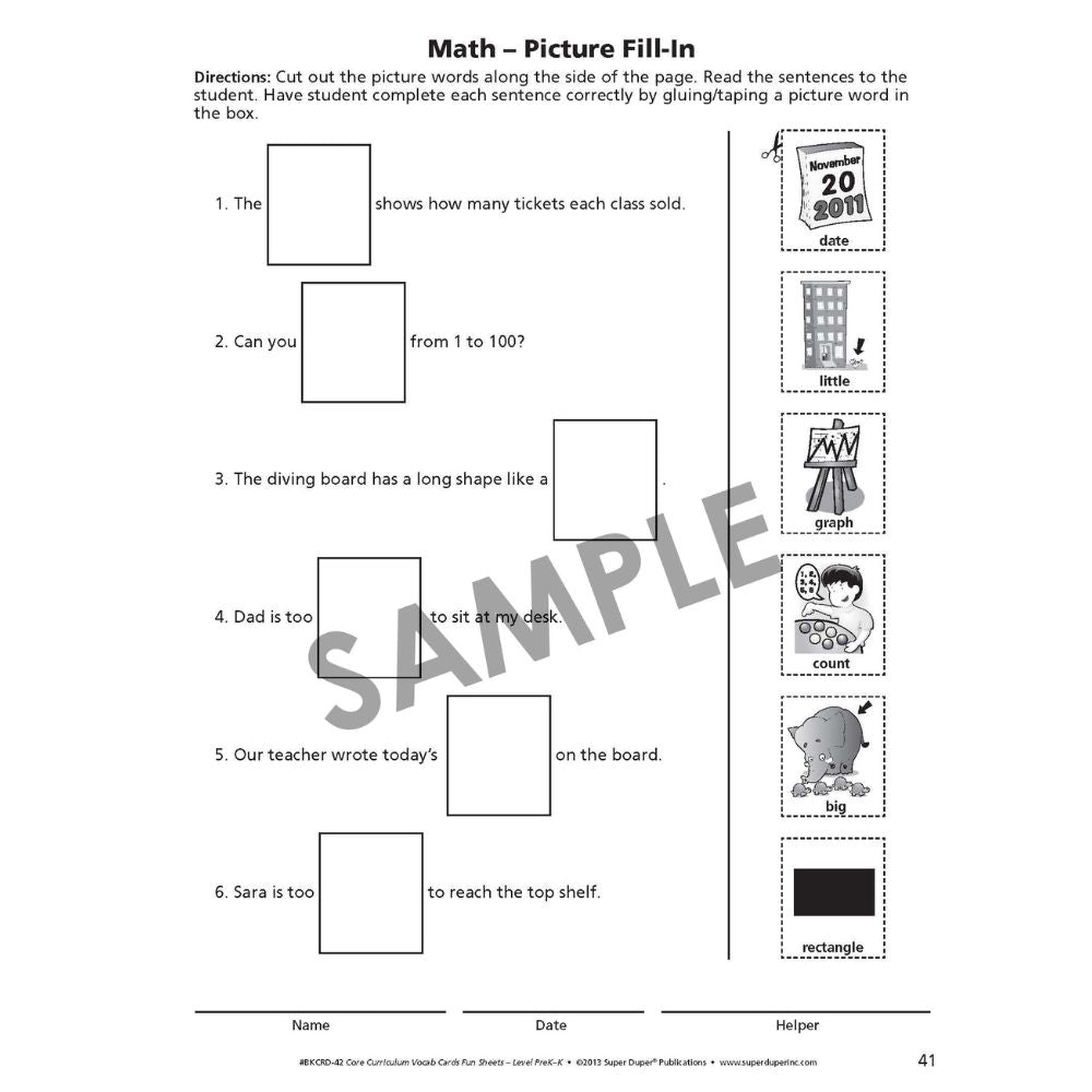 The Webber® Core Curriculum Vocabulary Cards and Fun Sheets are designed to build vocabulary skills in students in grades pre-kindergarten and up and children ages 3 and up. The Pre-K program is ideal for learners building foundational language skills in preparation for both pre-kindergarten and kindergarten.