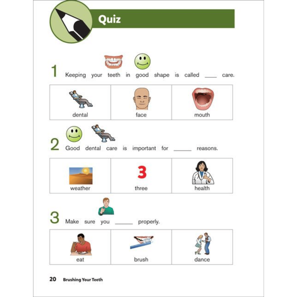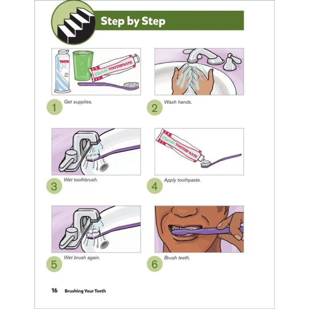 Each personal care skill is broken down into manageable steps using a task analysis format and reinforced through multiple modalities. The program combines printed visuals, videos, and interactive practice to support structured learning and routine building. Students benefit from repeated exposure and opportunities to apply skills in context, improving independence and generalization.