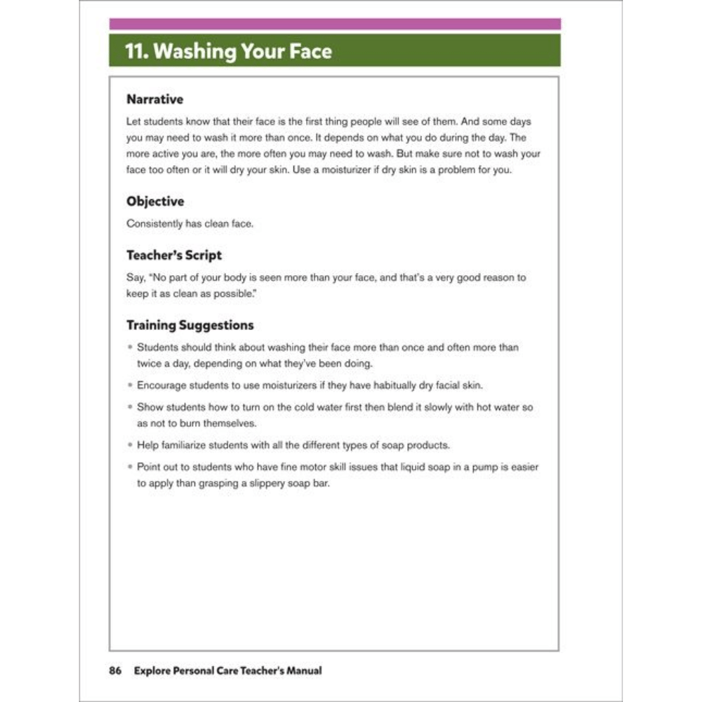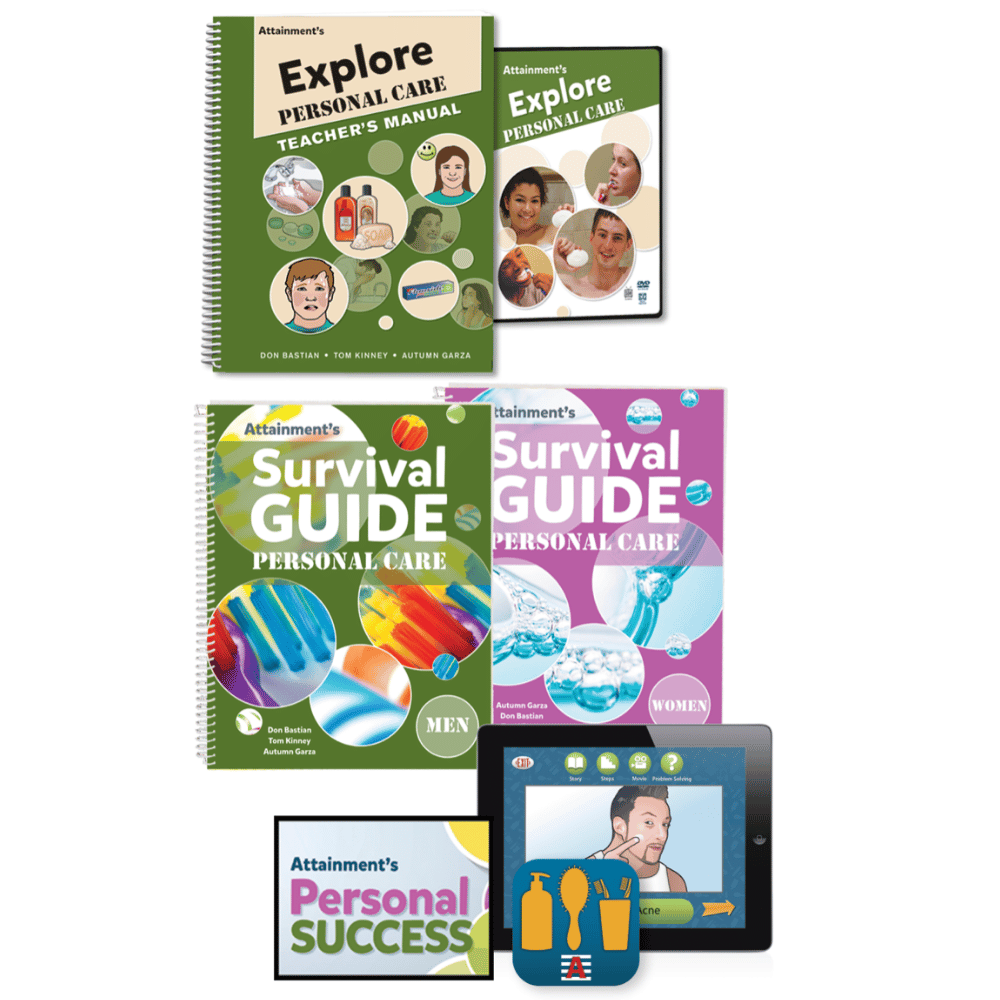 The Explore Personal Care curriculum helps adolescents and adults build independence with personal hygiene and appearance. This flexible, multimedia resource integrates text, video models, activity cards, and role play to support diverse learning styles. Designed for classroom or one-on-one instruction, it uses a task analysis approach to break down essential personal care skills step by step.