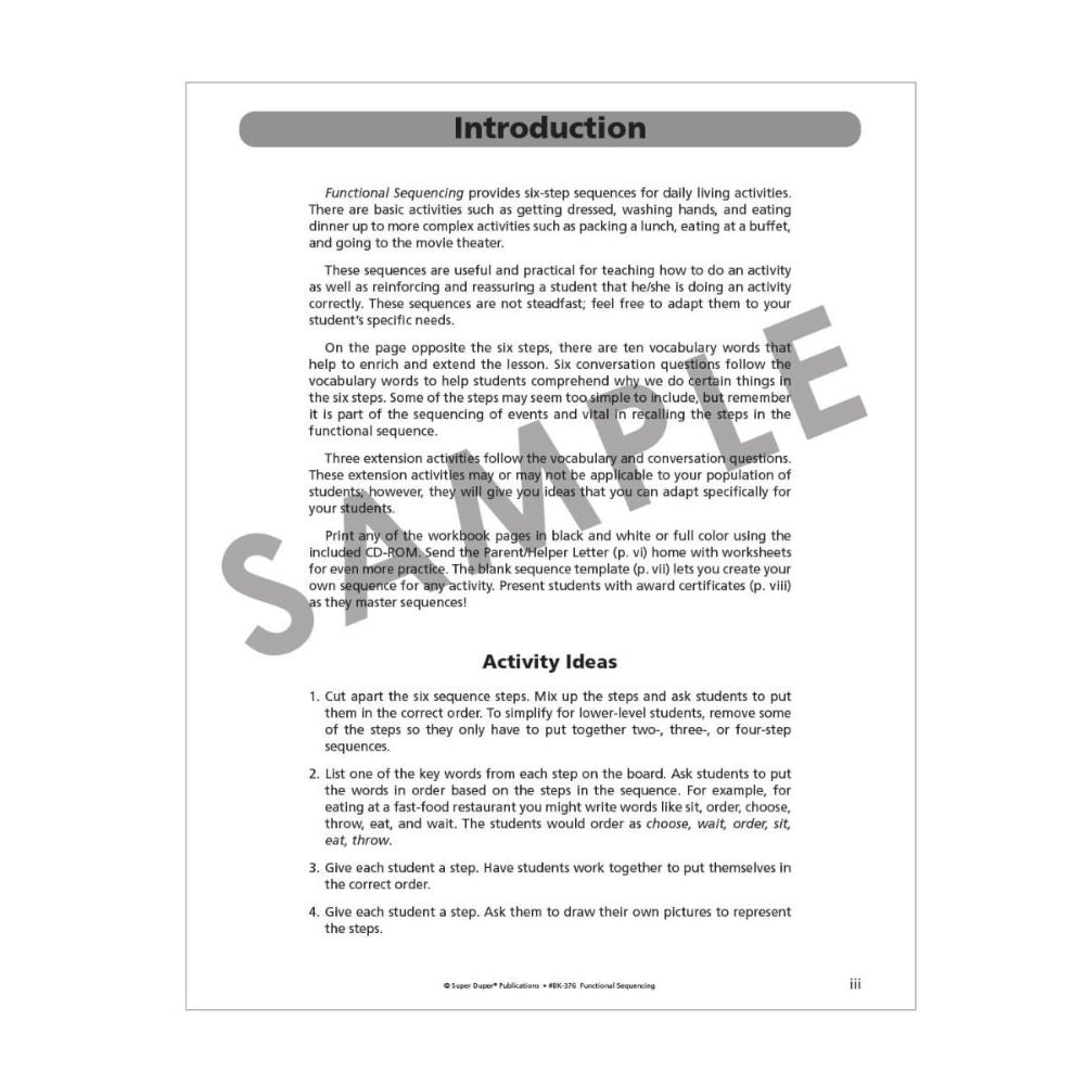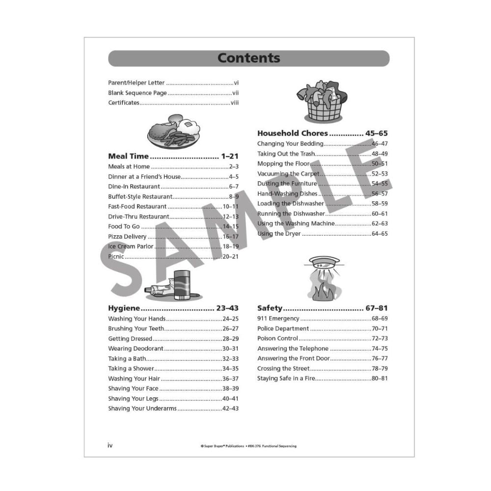The Functional Sequencing Activity Sheets for Daily Living Skills book includes:
