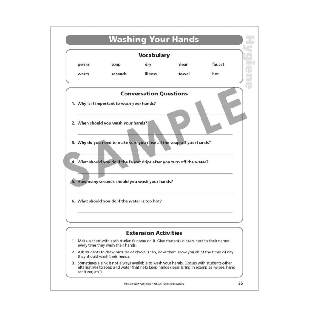 Each page of activities includes a six-step sequence. The opposite page has ten vocabulary words to help teach the lesson followed by six conversation questions for students to discuss and comprehend why we do certain things in each step. Follow-up extension activities will help students generalize and practice the information they learn. You can adapt these extension activities to the needs of a particular student or in other situations.
