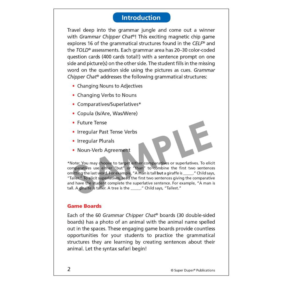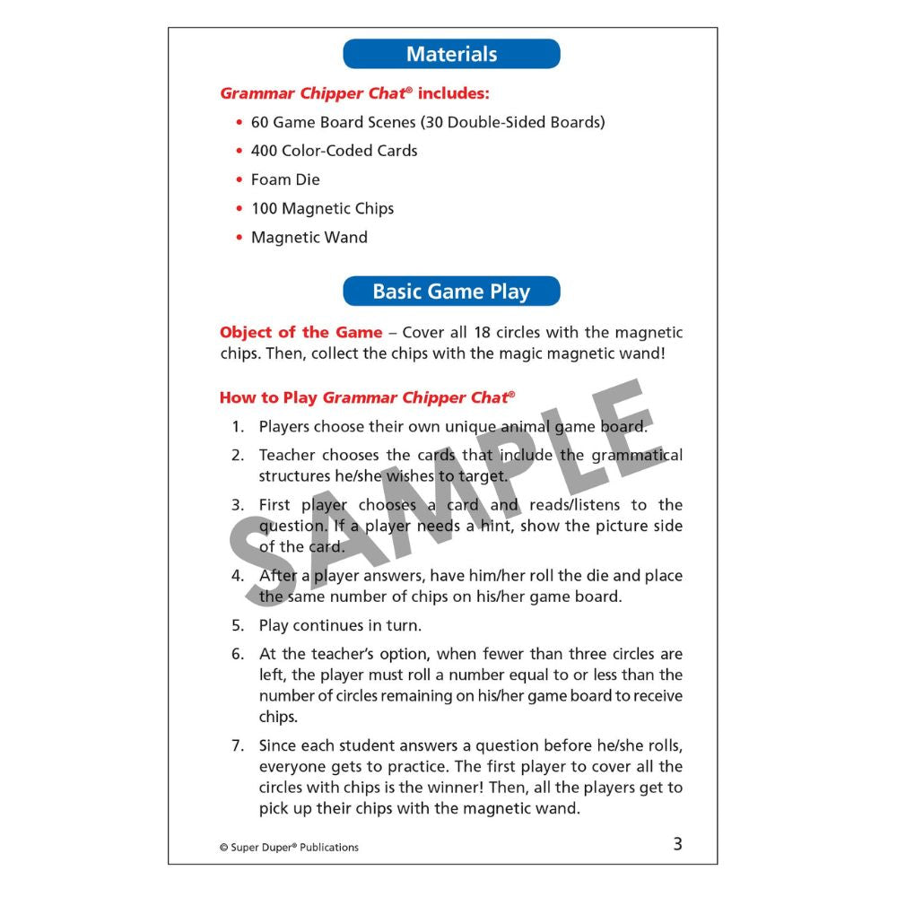 This exciting magnetic chip game explores 16 of the grammatical structures found on most language assessments, including the CELF and the TOLD. Grammar Chipper Chat® addresses the following grammatical structures: