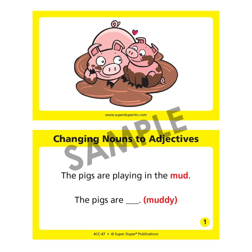 Each grammar area has 20 or 30 colour-coded question cards (400 cards total!) with a sentence prompt on one side and picture(s) on the other side. The student fills in the missing word on the question side using the pictures as cues.