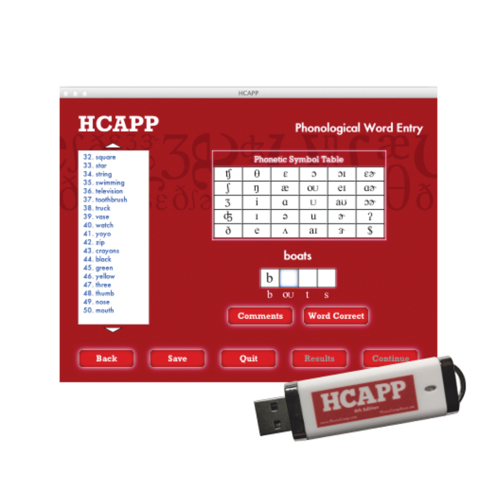 HCAPP is efficient and user-friendly. Use the phonetic symbols (provided in the software) to enter the child’s productions of 50 words used on the HAPP-3. Once entered, click the Results button. Utterances are instantly scored for phonological deviations, and a report—including suggested goals—is generated. Compare the TOMPD score generated in HCAPP to the data provided in the HAPP-3 to determine a standard score. Client data can be stored for future retrieval.