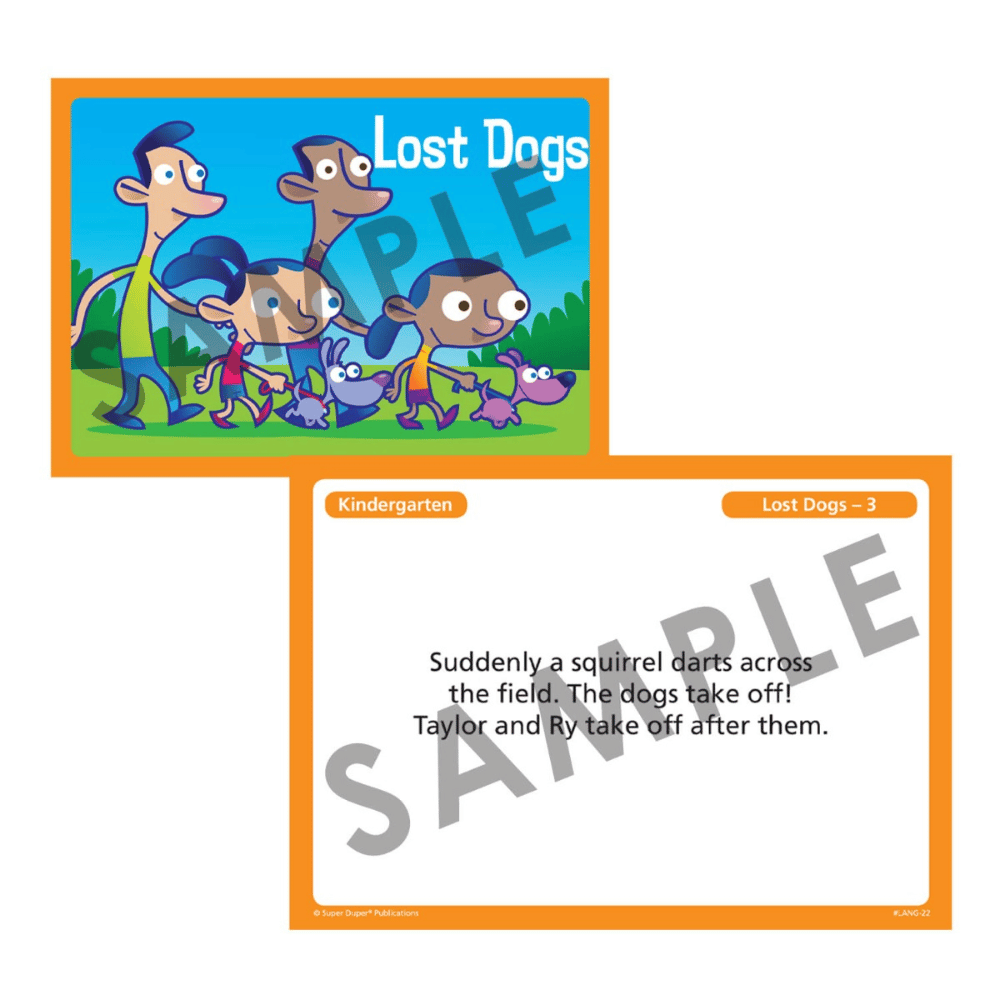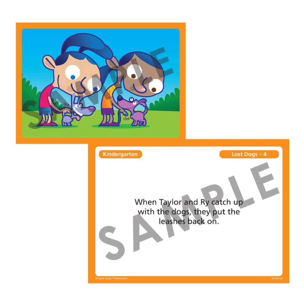 Language LAB targets verbs (regular and irregular tenses), adverbs, nouns (regular and irregular plurals), adjectives, and connected speech (clauses, conjunctions, negatives, direct and indirect objects). It also includes a Story Station with scripted lessons for teaching narrative skills at three levels: kindergarten, 1st–2nd grade, and 3rd–4th grade. Students learn to use basic story grammar components to retell a story, create a story, and add “sparkle” and cohesiveness to the stories they create. During these scripted Story Station lessons, the SLP closely monitors the use of target language skills.