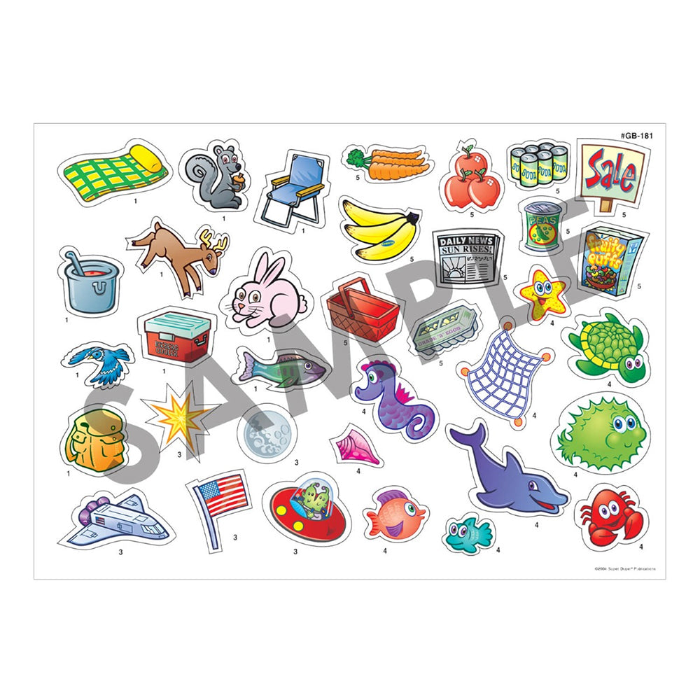 - 10 gorgeous game boards (two of each scene: camping, picnic, outer space, ocean, and grocery store)
