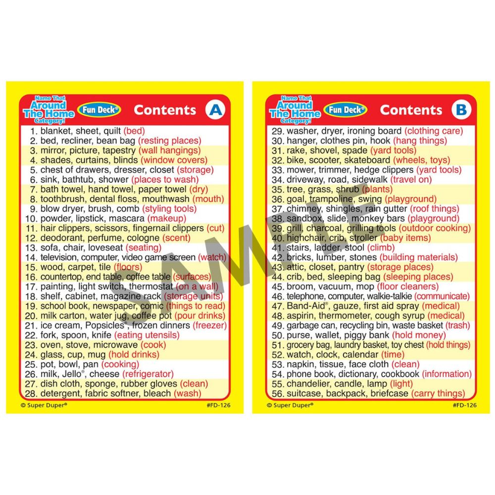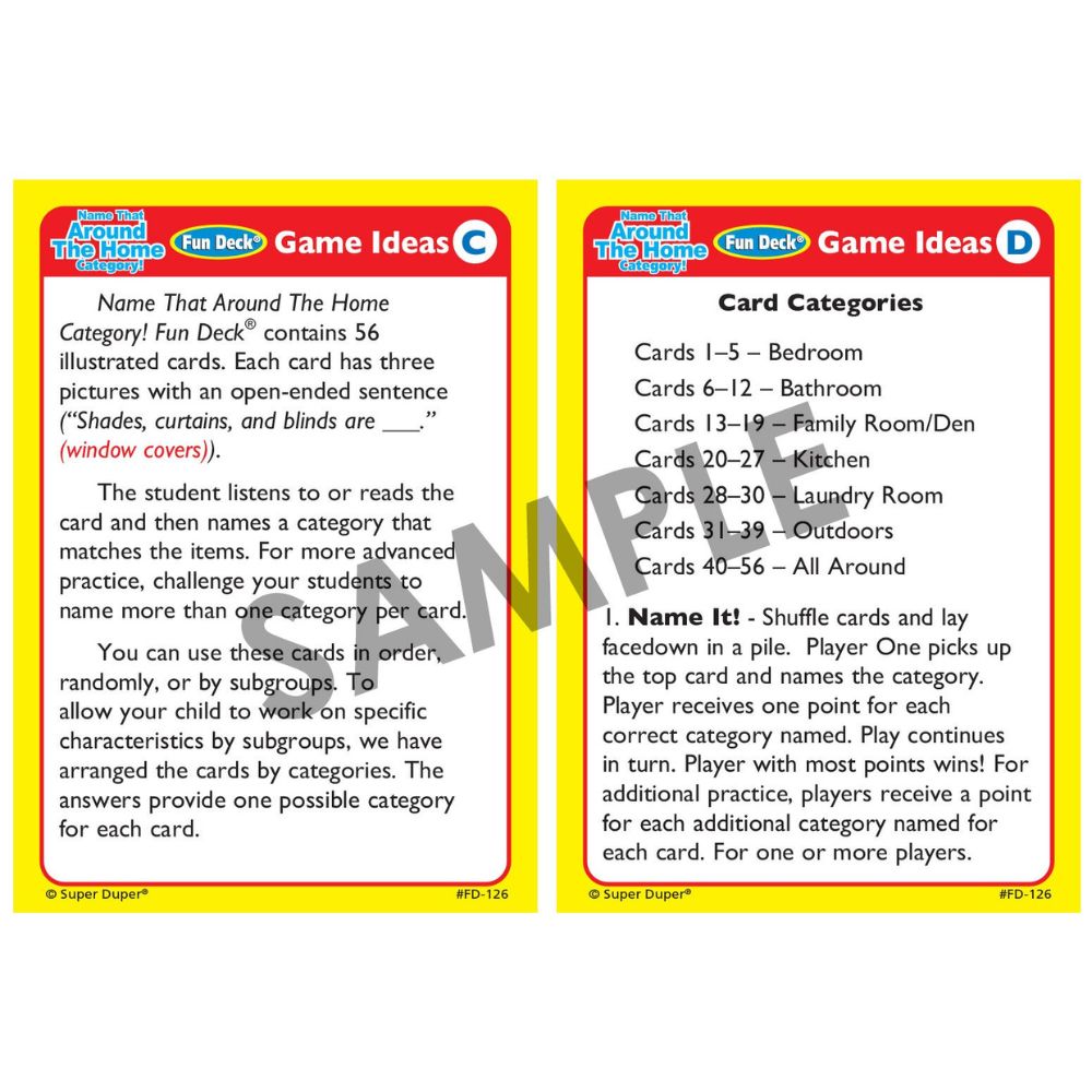 Improve categorizing, describing, and organizational skills using familiar objects around the home with the Name That Around the Home Category! Fun Deck®.