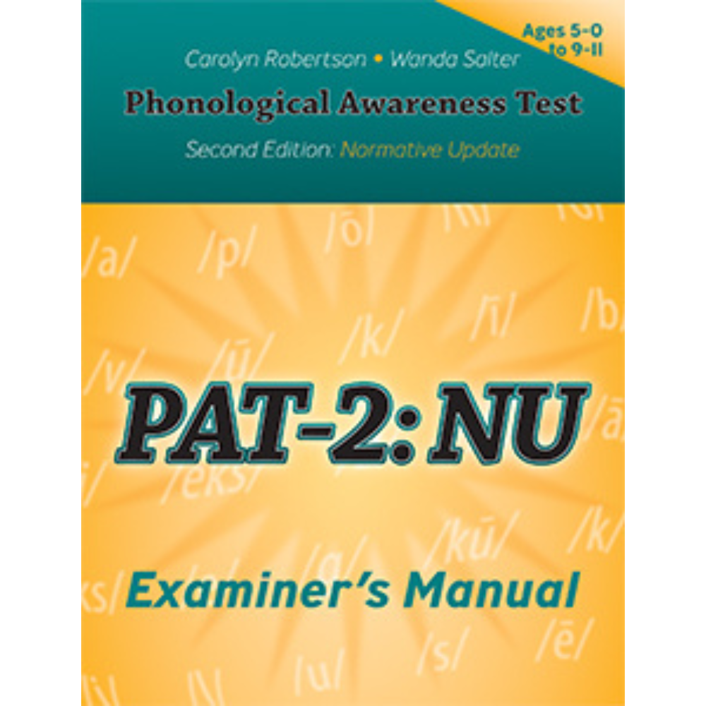 The PAT-2:NU is a standardized assessment of phonological awareness, phoneme-grapheme correspondence, and phonemic decoding skills. Test results help educators focus on those aspects of oral language that may not be systematically targeted in classroom reading instruction.