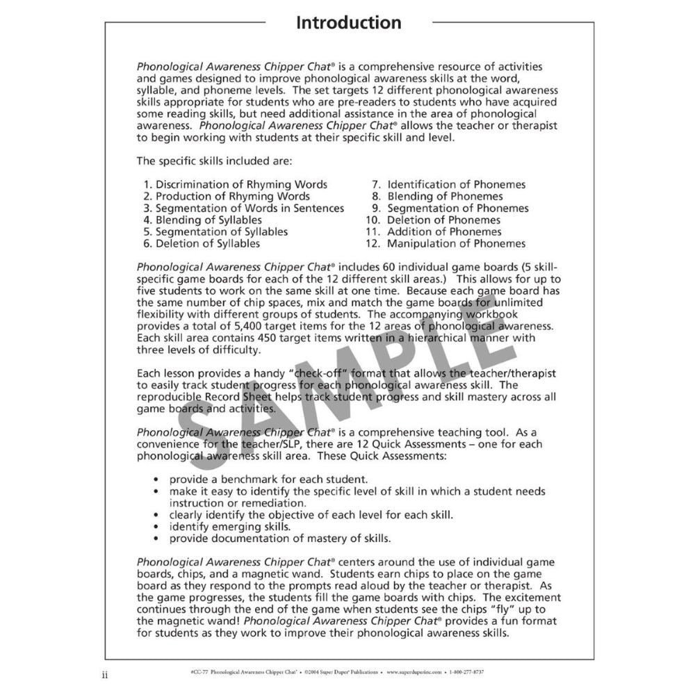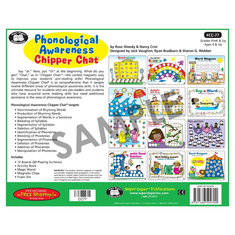 Phonological Awareness Chipper Chat® is the ultimate resource for students who are pre-readers and students who have acquired some reading skills, but need additional assistance in the area of phonological awareness. This game is so comprehensive that it targets twelve different areas of phonological awareness skills including:
