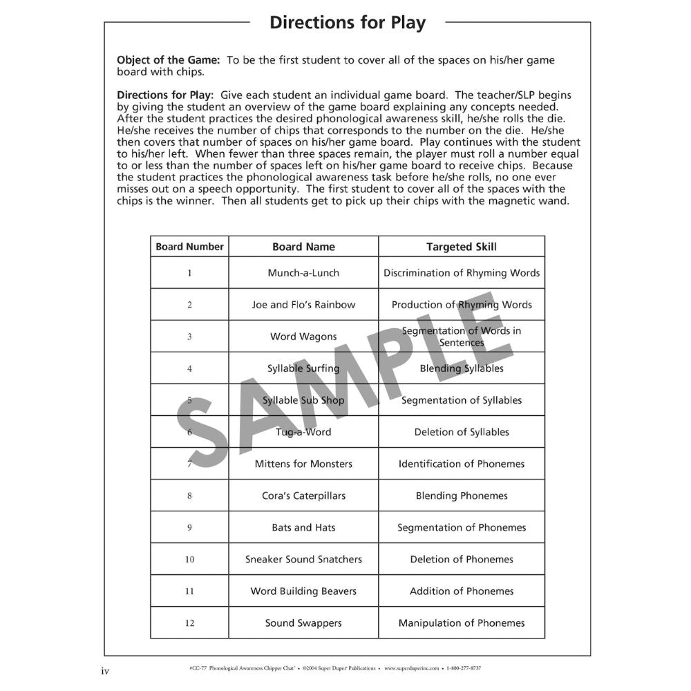 - A total of 60 individual game boards (5 boards for each of the 12 phonological skills, 11" x 10")