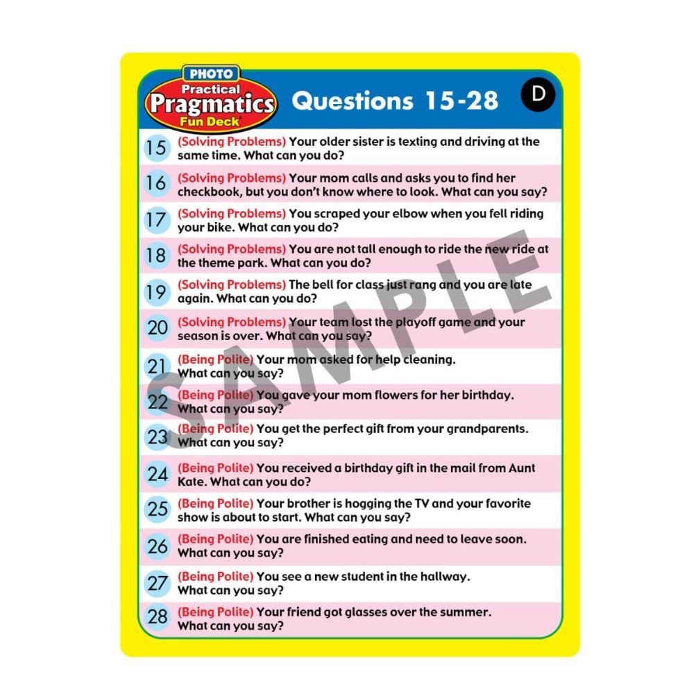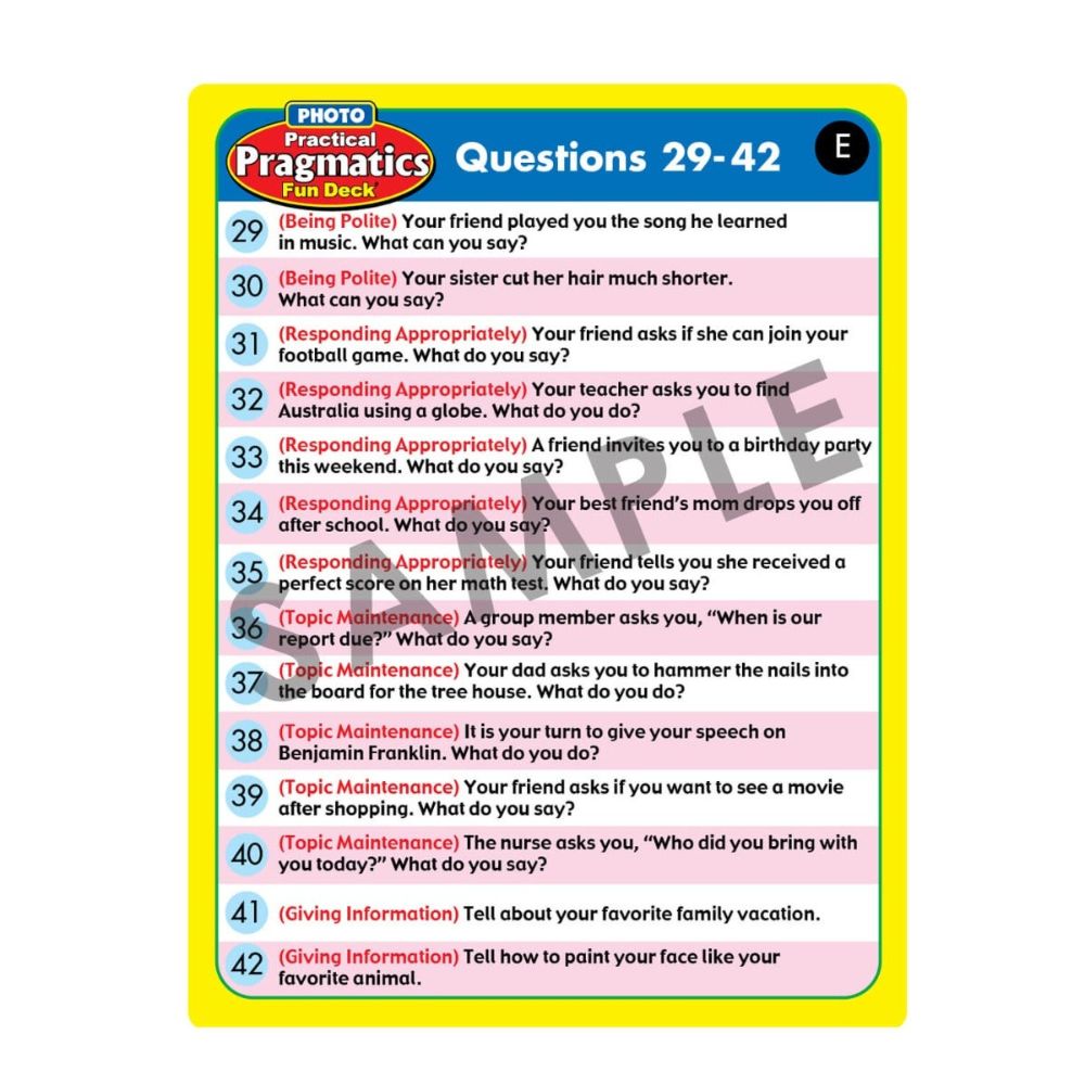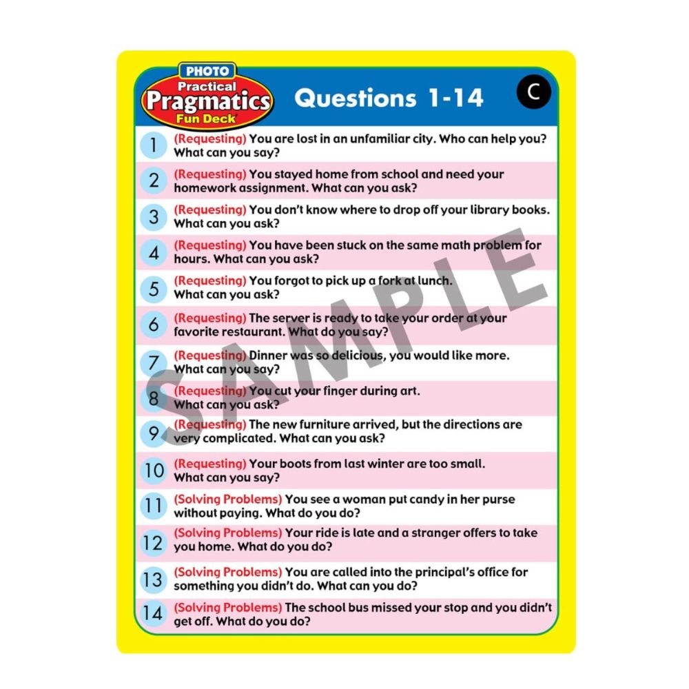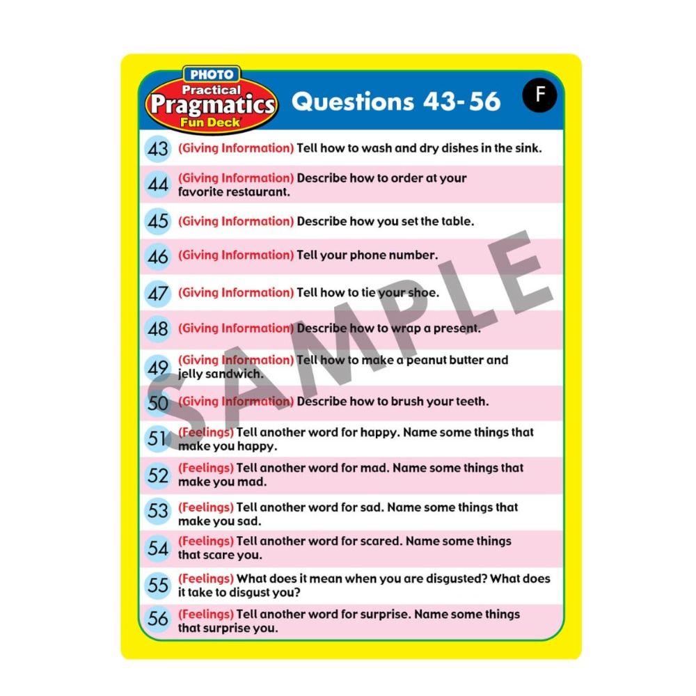 The Photo Practical Pragmatics Fun Deck features 56 skillfully photographed cards —perfect for completing familiar and creative extension activities!