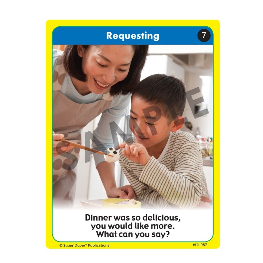 Each card features a photograph and prompt, and falls into one of 7 different pragmatic language categories: