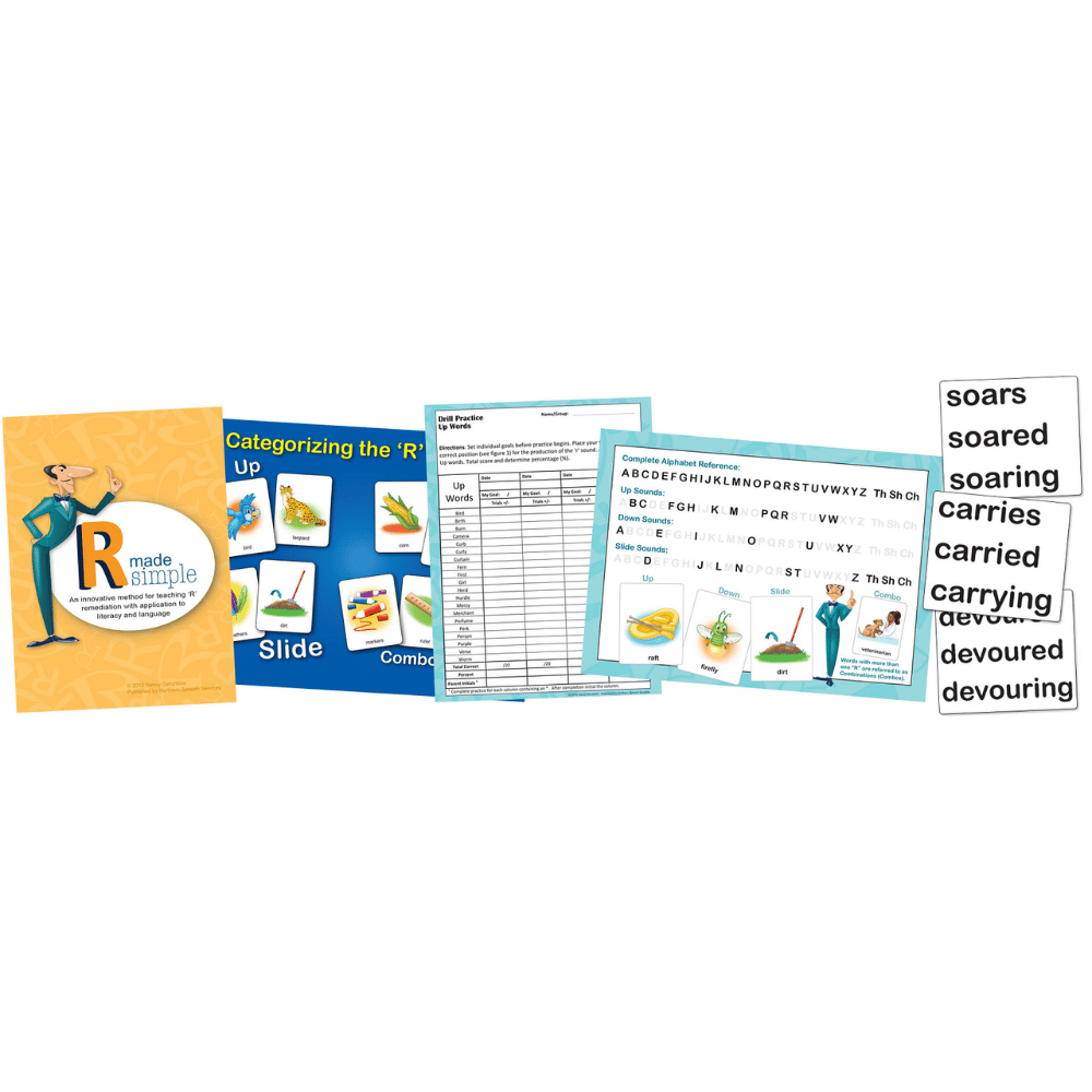 R Made Simple teaches children to analyze the sound before the ‘R’ and use one of three tongue placements: Up, Down, or Slide, to correctly produce any ‘R’ sound, regardless of spelling or context. This complete speech therapy program simplifies R articulation and blends articulation, language, and literacy goals into one effective, easy-to-teach system.
