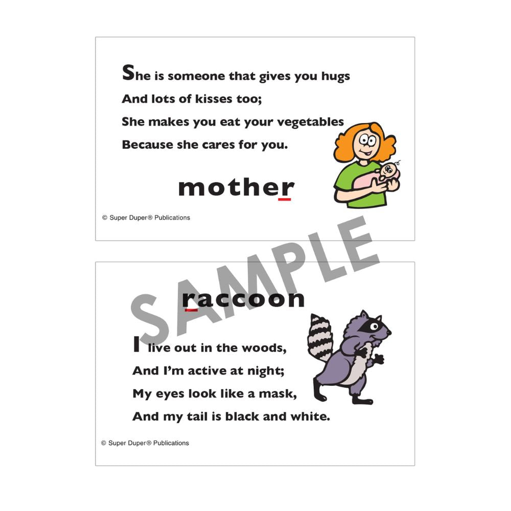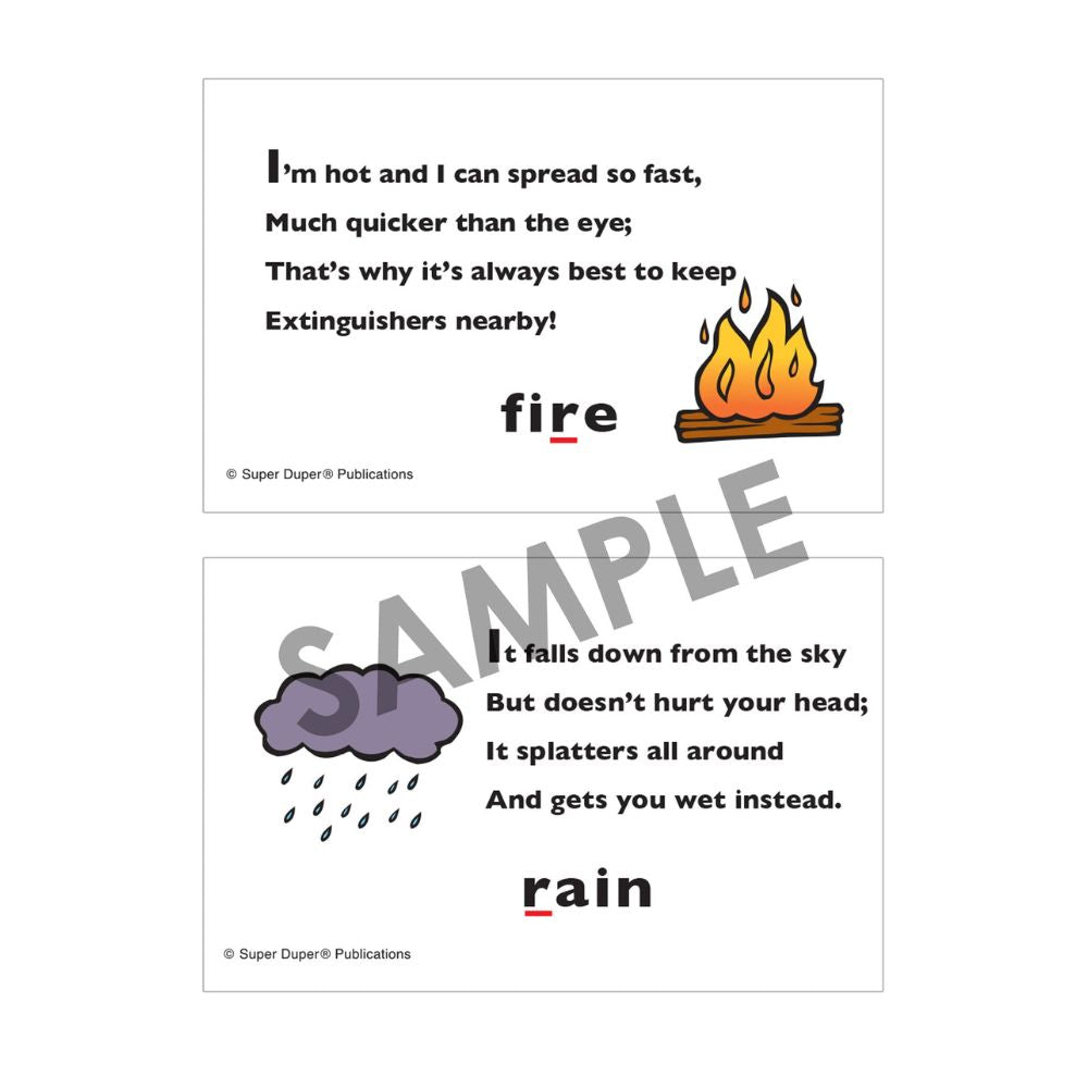 - 192 riddle word calling cards (2⅛" x 3⅝"). (The caller reads the riddle and has students guess the answer or shows the target picture to the students and says the word!)