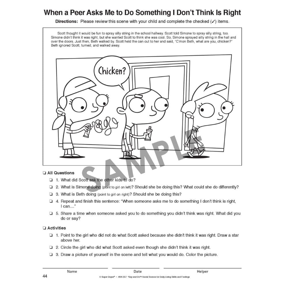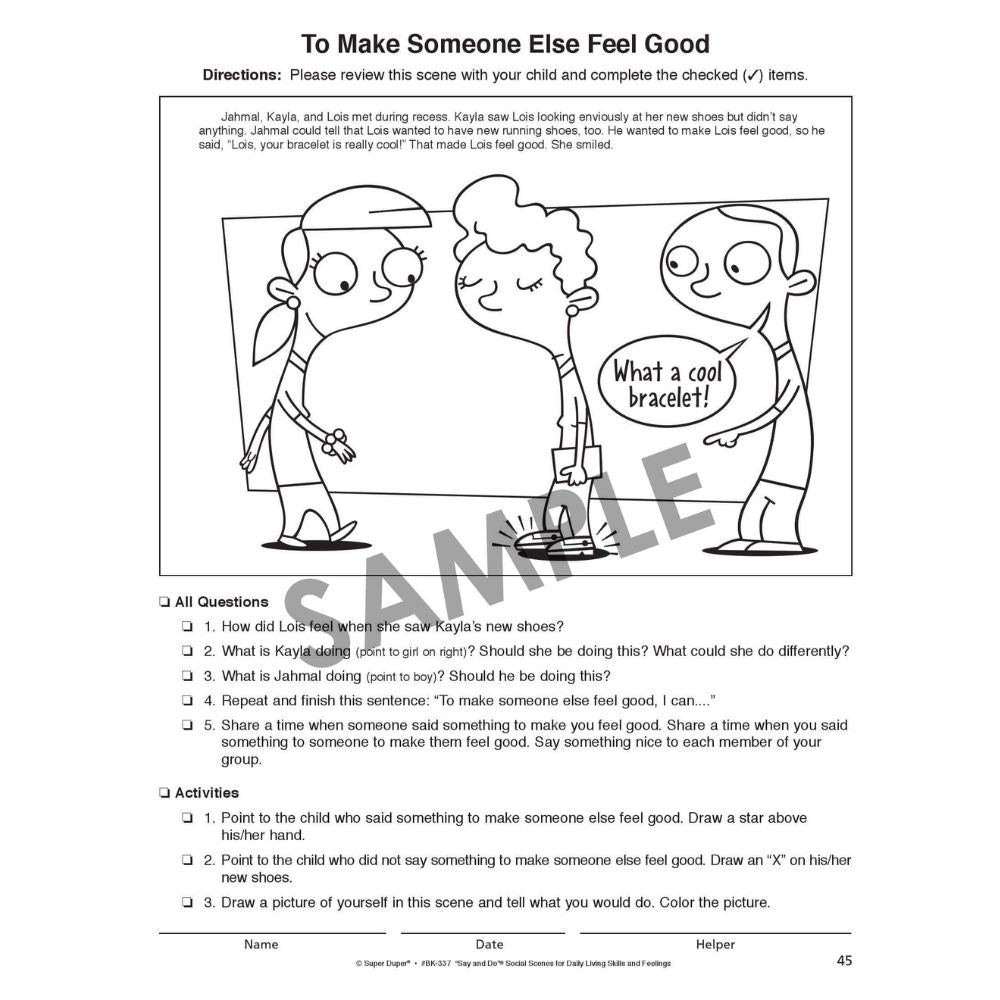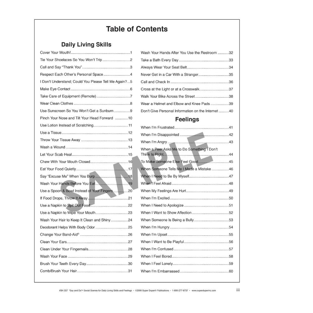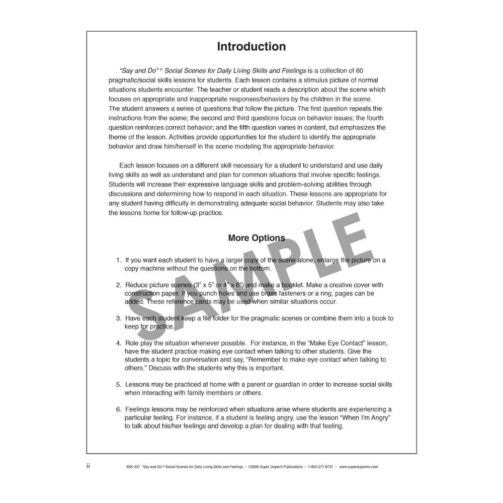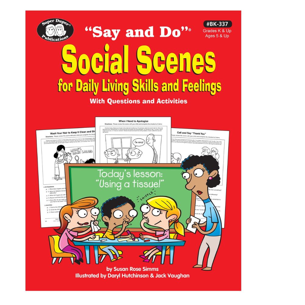 - "Say and Do" Social Scenes for Daily Living Skills and Feelings which helps students understand and practice daily living skills as well as understand and plan for typical situations involving specific feelings (64 pages)