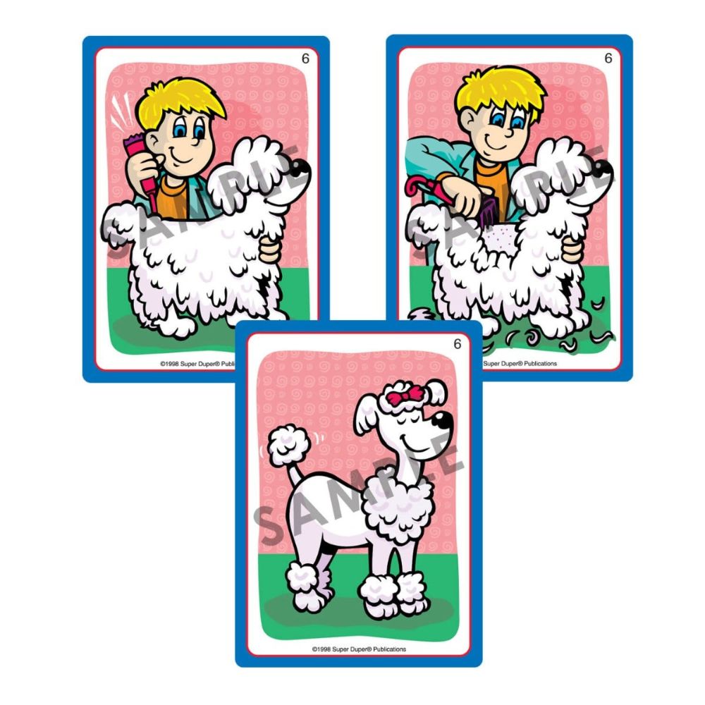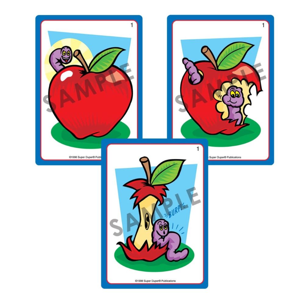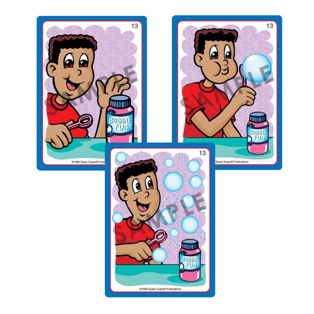 Each card set includes 19 sets of three step-sequenced pictures to stimulate storytelling and prediction skills. Additional card lists and instruction/idea cards help brighten your therapy session.