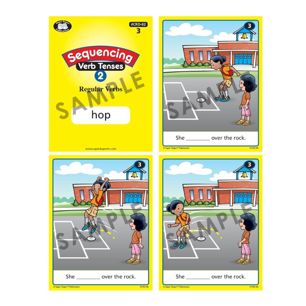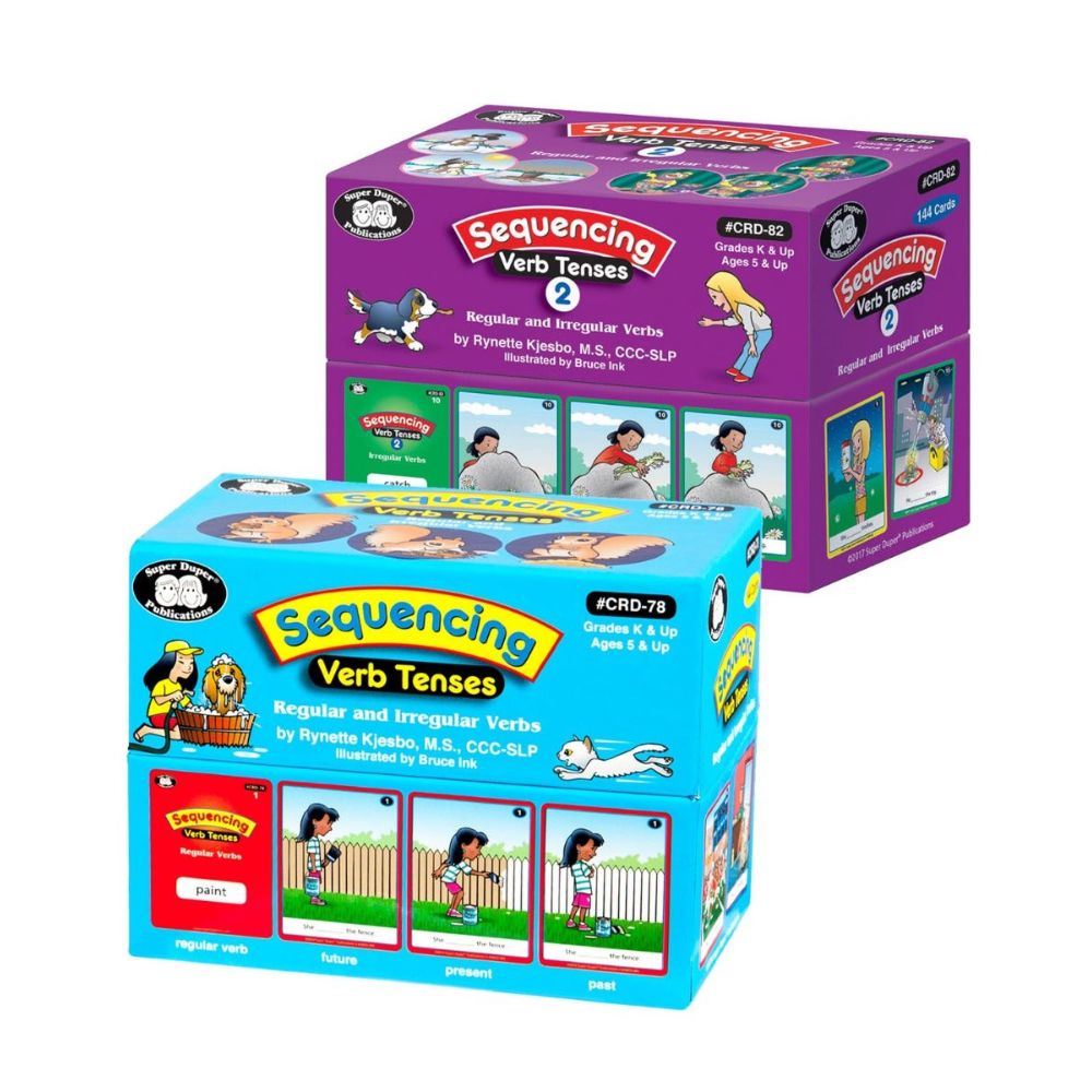 The Sequencing Verb Tenses Card Decks are designed to target language development in students in grades kindergarten and up and children ages 5 and up.Ā The colourful cards offer engaging illustrations and clear, concise examples, making them a versatile and interactive way to facilitate learning. Whether used in one-on-one sessions or group activities, they make grammar and language development an engaging adventure.