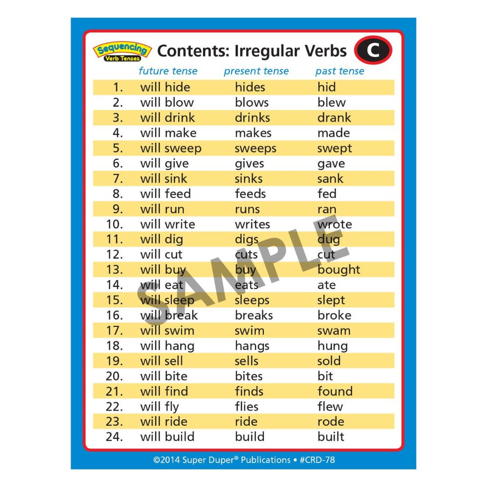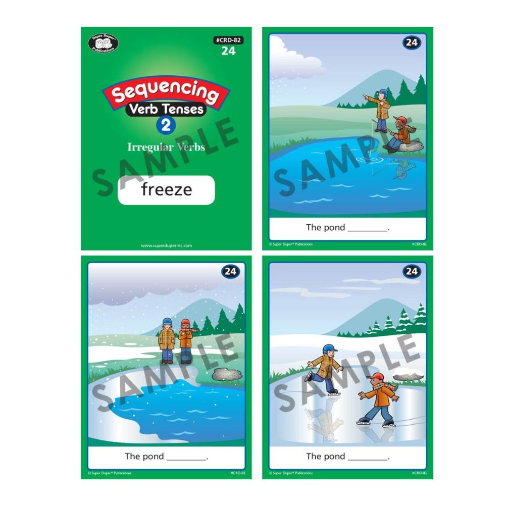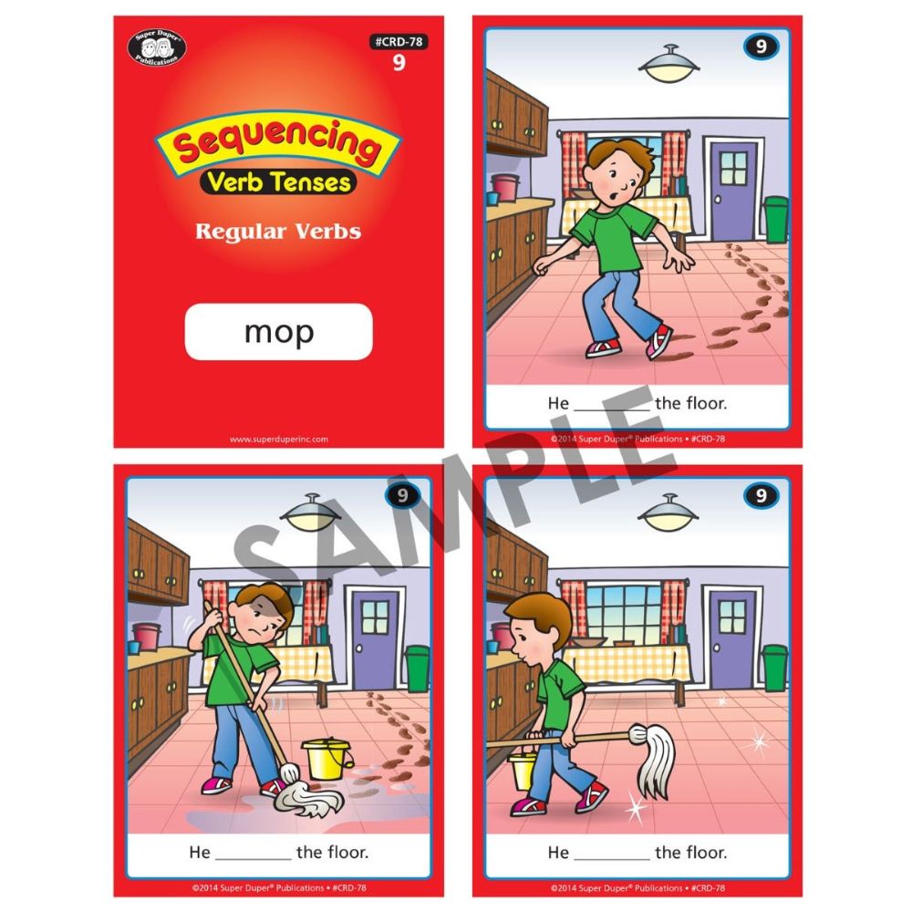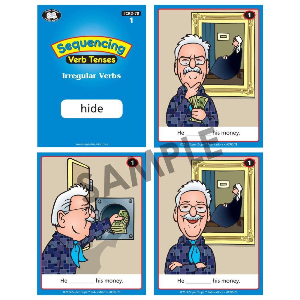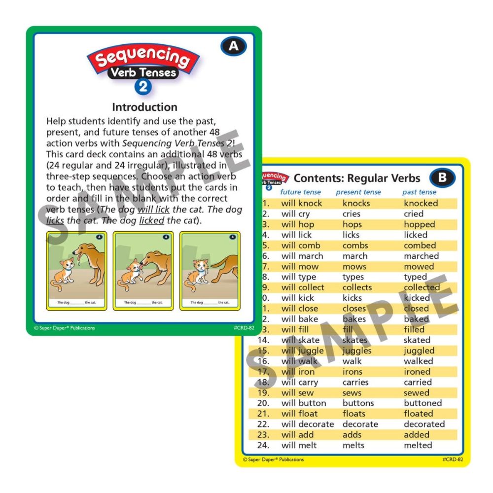 Help students identify and use the past, present, and future tenses of 96 action verbs. Both of the card decks in this set contain 24 regular and 24 irregular 3-step, illustrated verb sequences. Choose an action verb to teach, and then have students put the cards in order while filling in the blanks with the correct verb tenses.