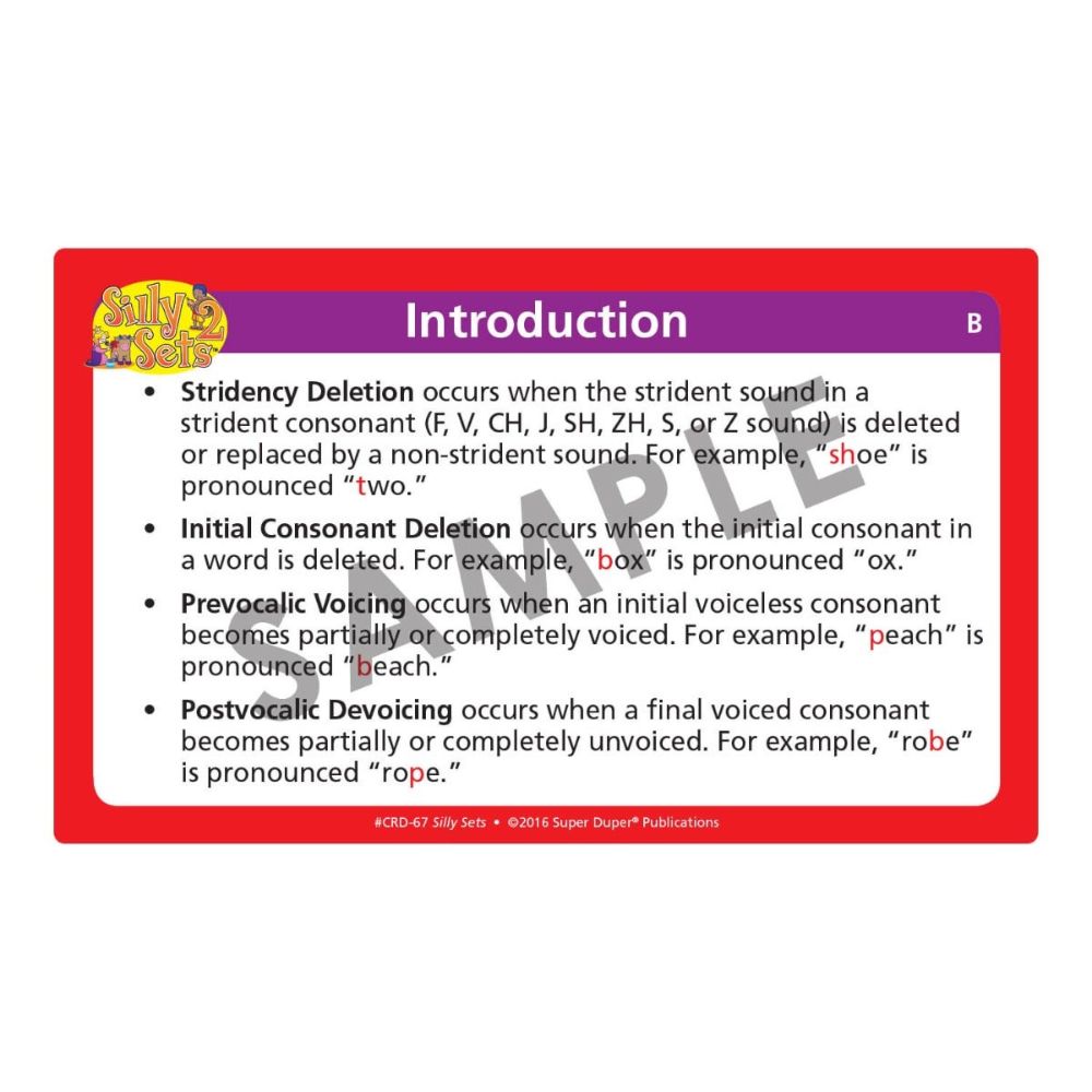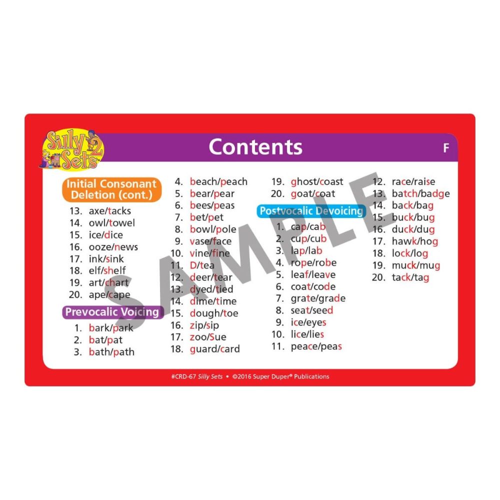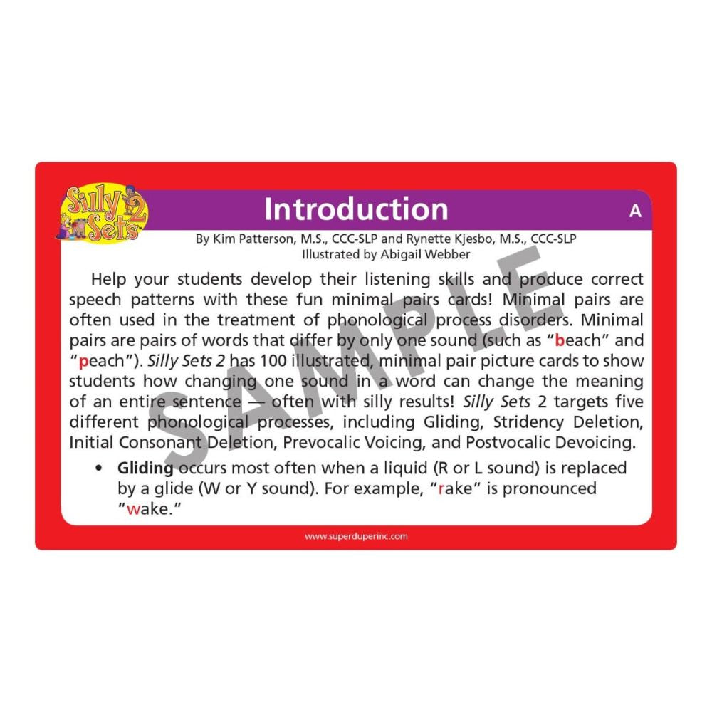 Silly Sets 2 has 100 illustrated minimal pair picture cards to show children how changing one sound in a word can affect the meaning of an entire sentence – often with silly results! Silly Sets 2 targets five different phonological processes including: