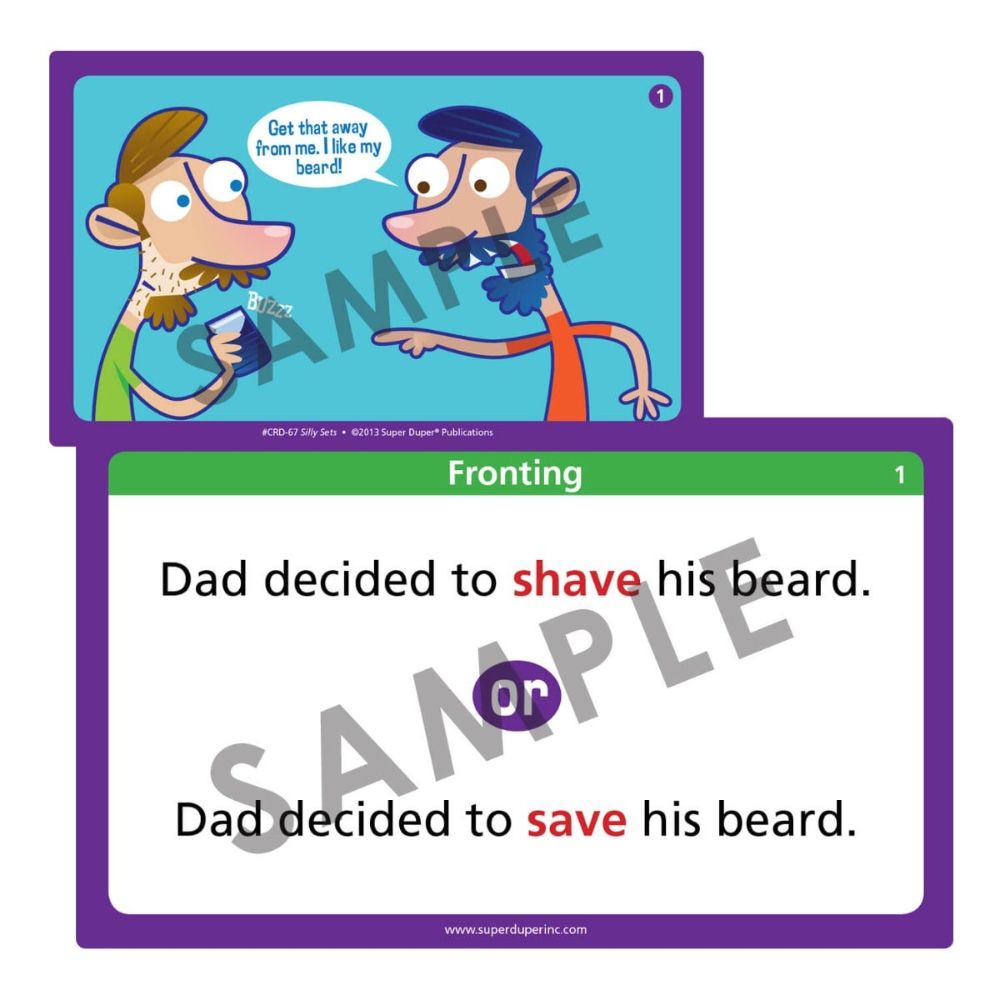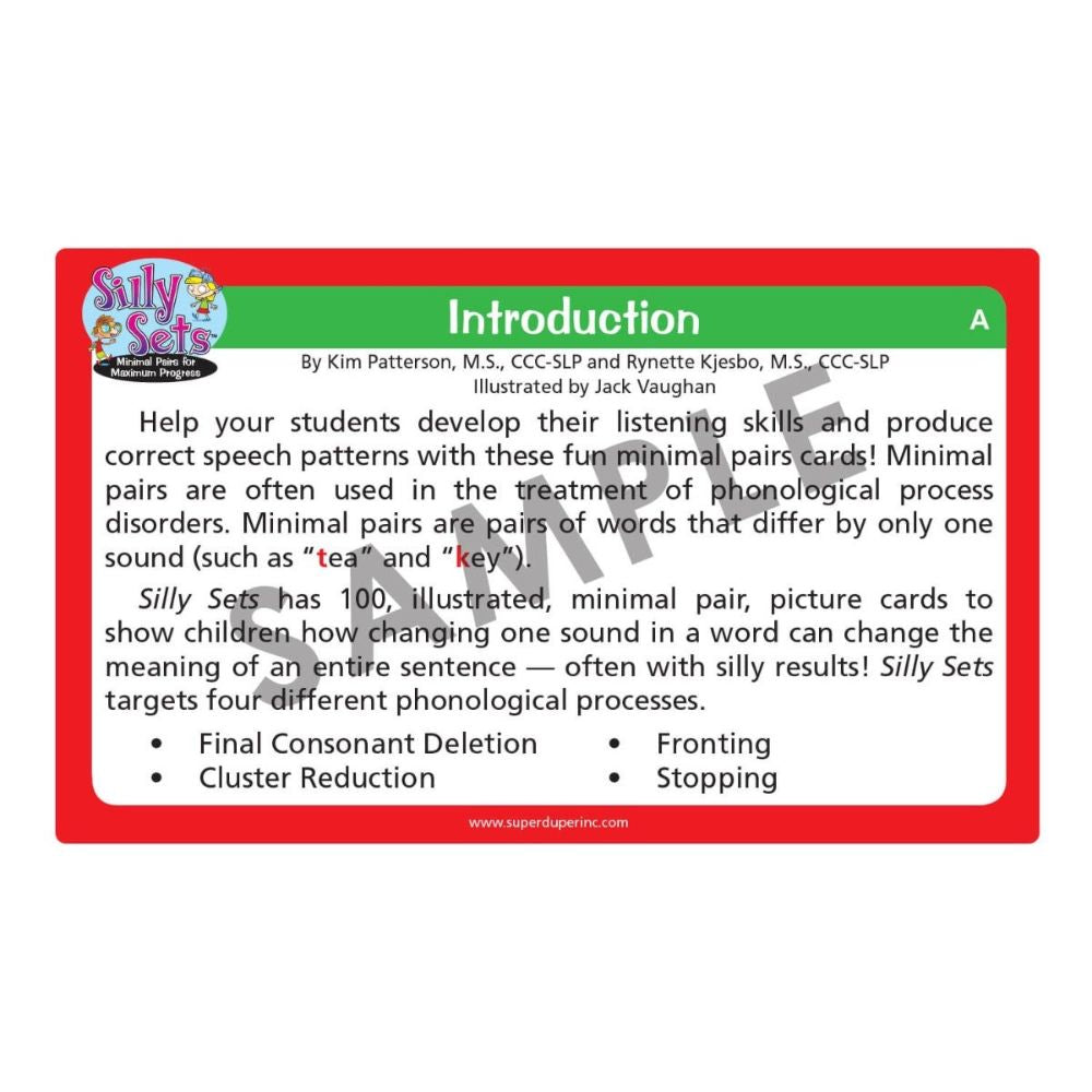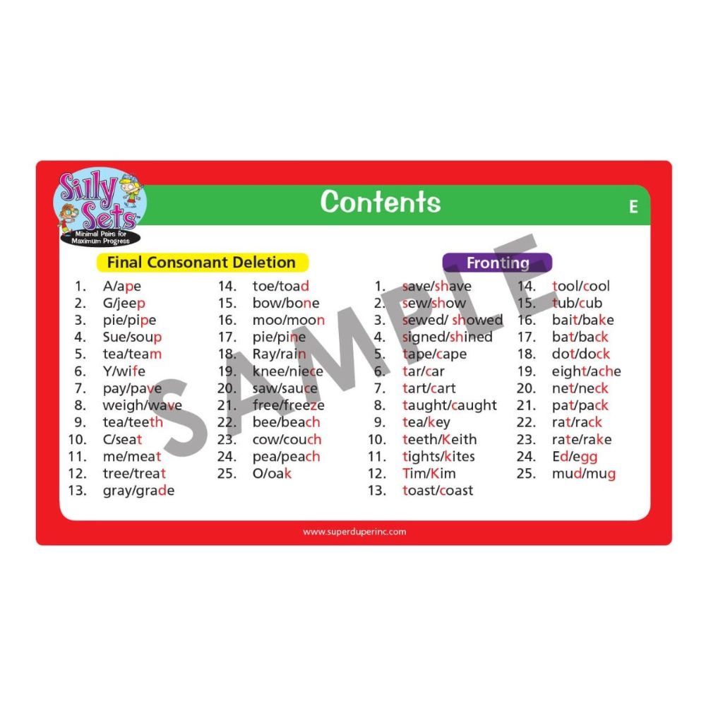 Silly Sets has 100 illustrated minimal pair picture cards to show children how changing one sound in a word can affect the meaning of an entire sentence – often with silly results! Silly Sets targets four different phonological processes, including: