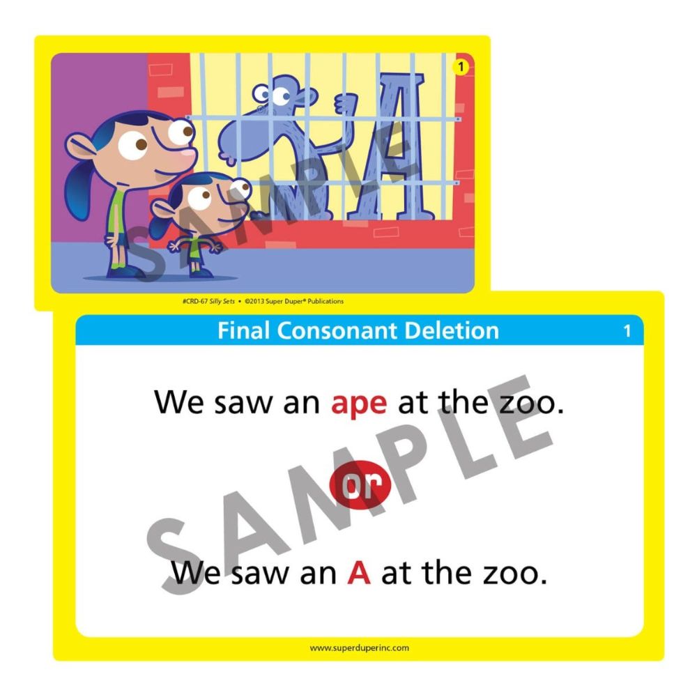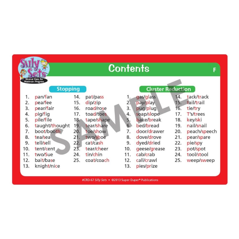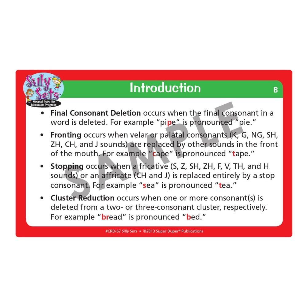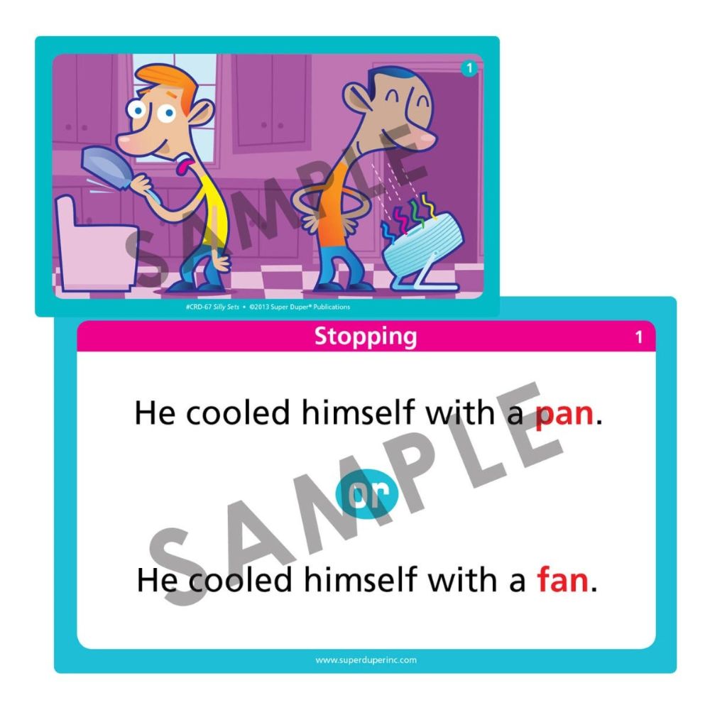 Silly Sets has 100 illustrated minimal pair picture cards to show children how changing one sound in a word can affect the meaning of an entire sentence – often with silly results! Silly Sets targets four different phonological processes, including: