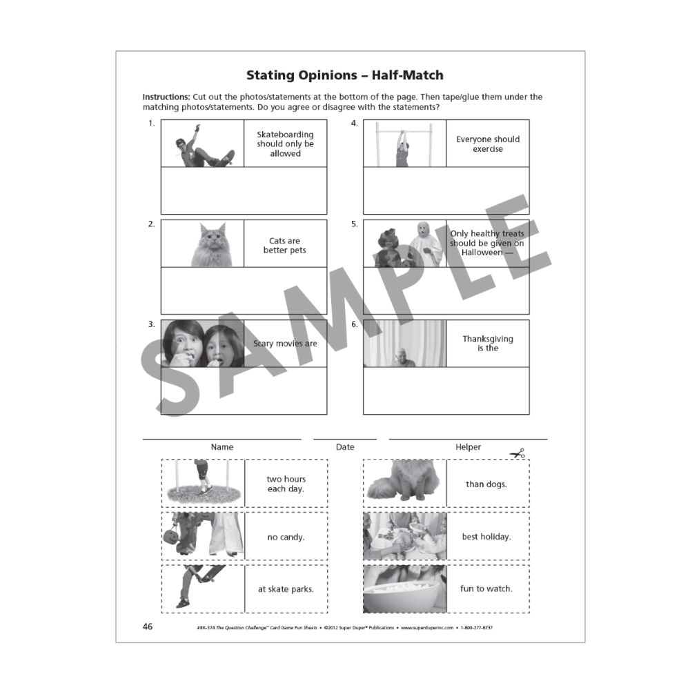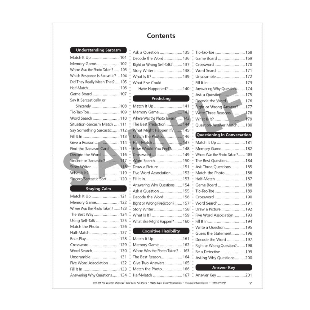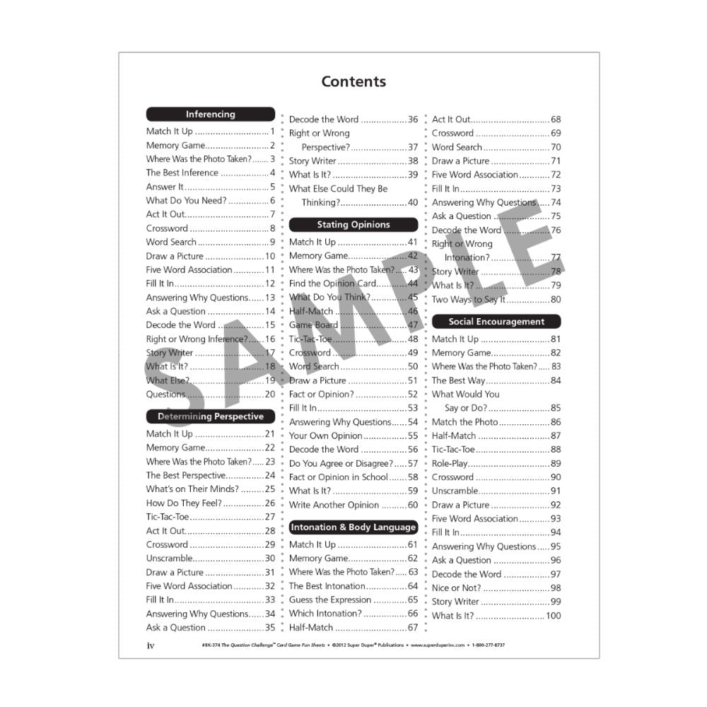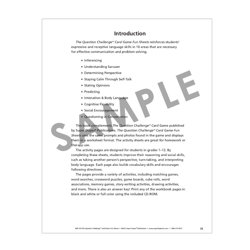 The Question Challenge® Card Game Fun Sheets is a versatile tool designed to improve language, reasoning, and social skills in students in grades 1-12 and children ages 6 and up.
