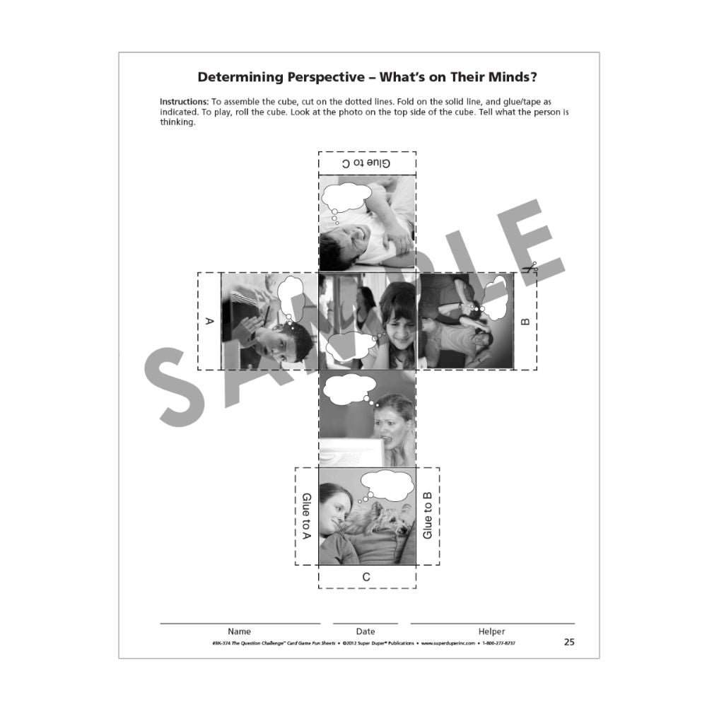 Completing these activities helps students improve and generalize their reasoning and social skills, such as taking another person’s perspective, turn-taking, and interpreting body language. Each page builds vocabulary skills and encourages following directions.