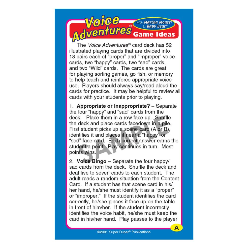 The set has 13 pairs of picture scene cards demonstrating "correct" voice habits, and 13 pairs of "incorrect" habits (52 in all!). For extra game variations, you get four "happy/sad" cards, and two "wild" cards.