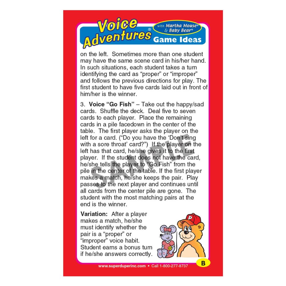 Baby Bear and Martha Mouse are working together to teach your students the difference between "proper" vs. "improper" voice habits with this vibrant card deck.