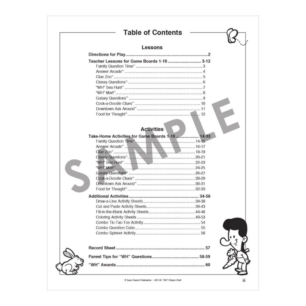 - The large number of "wh" questions range from simple to complex and give children many opportunities to practice answering and asking questions