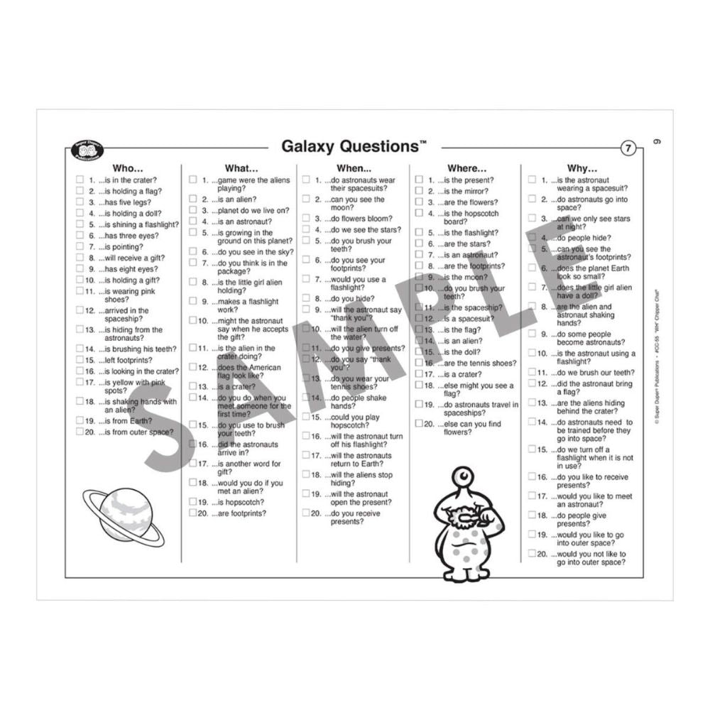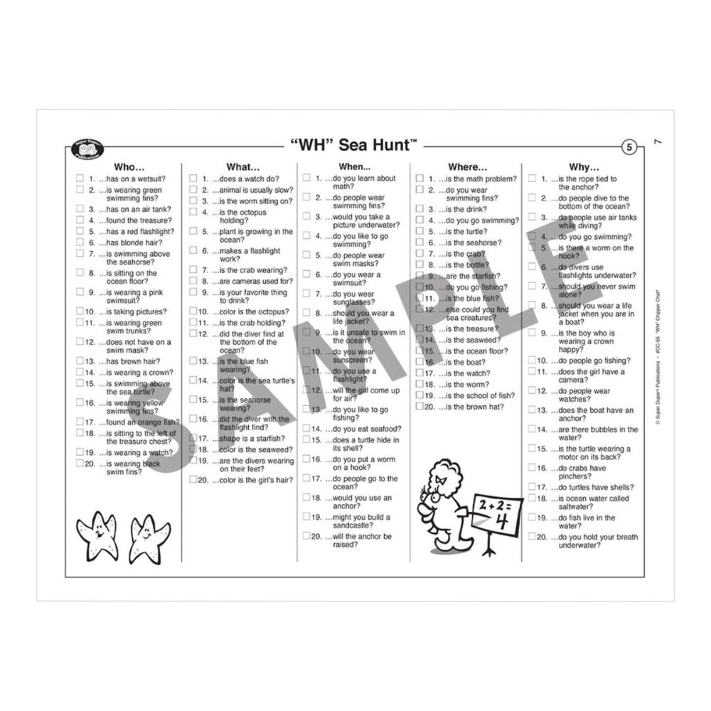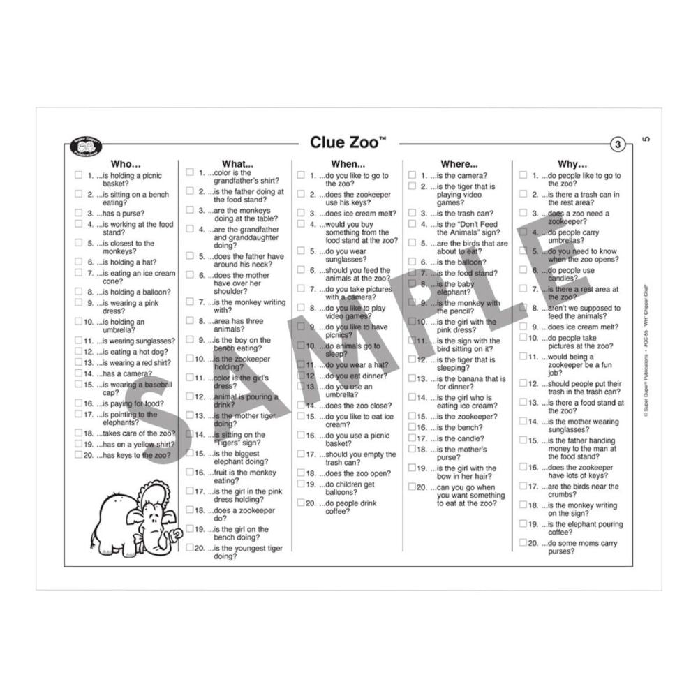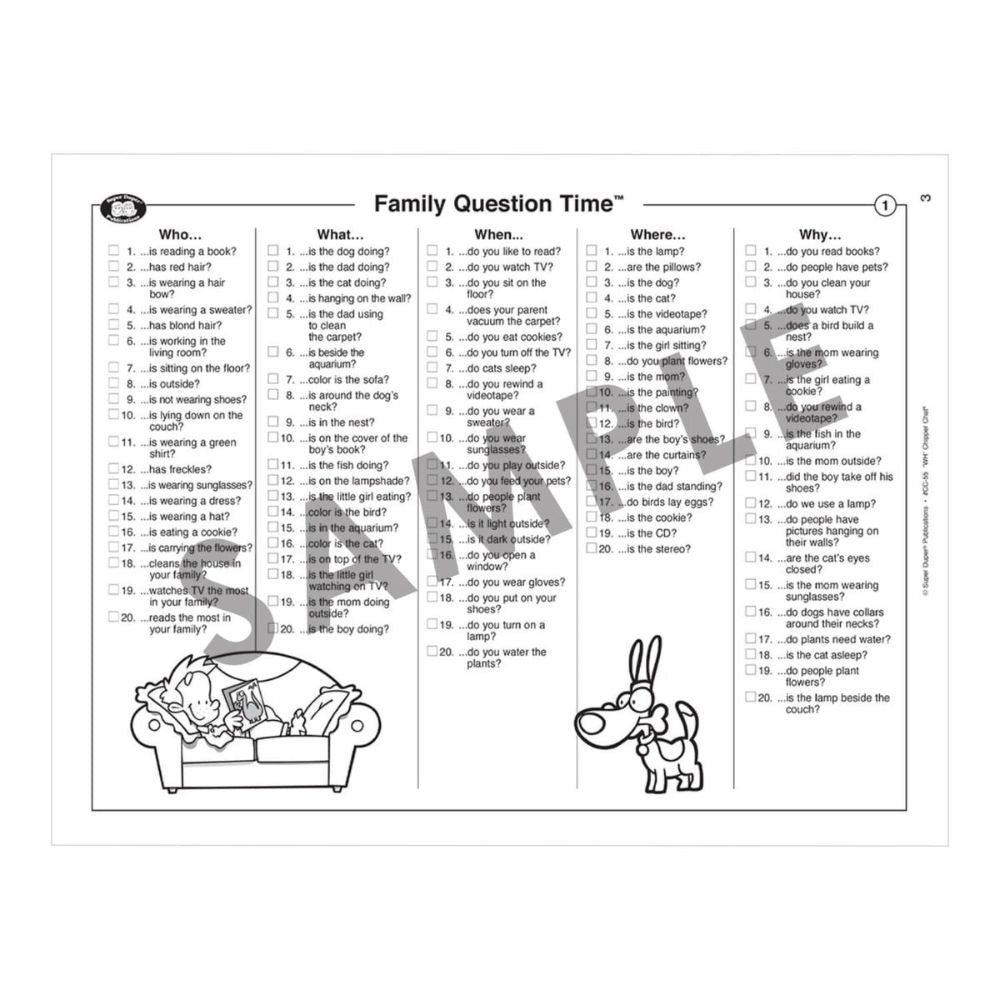 Each scene has a lesson plan with 100 "WH" questions (20 each of Who, What, When, Where, and Why). That's 1,000 questions in all! A handy "check off" form makes it easy to keep track of the questions you are asking.
