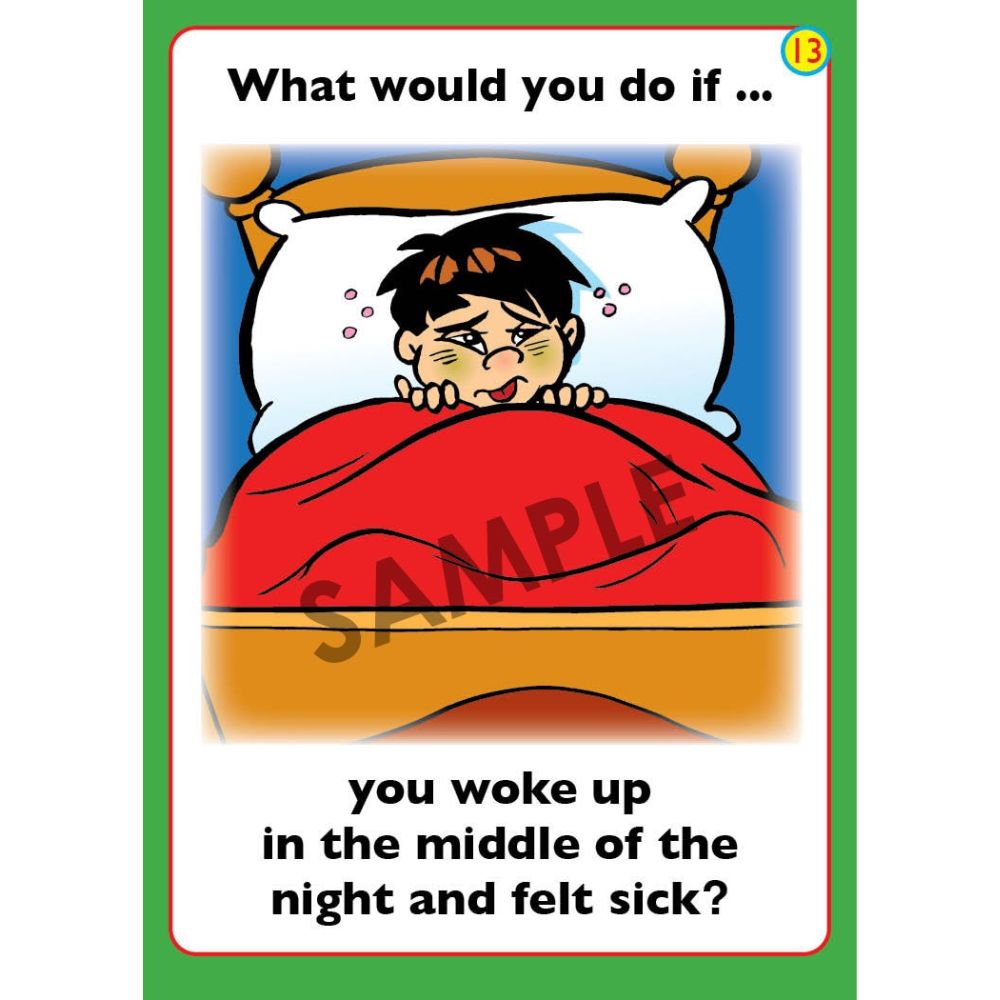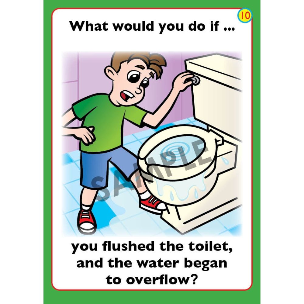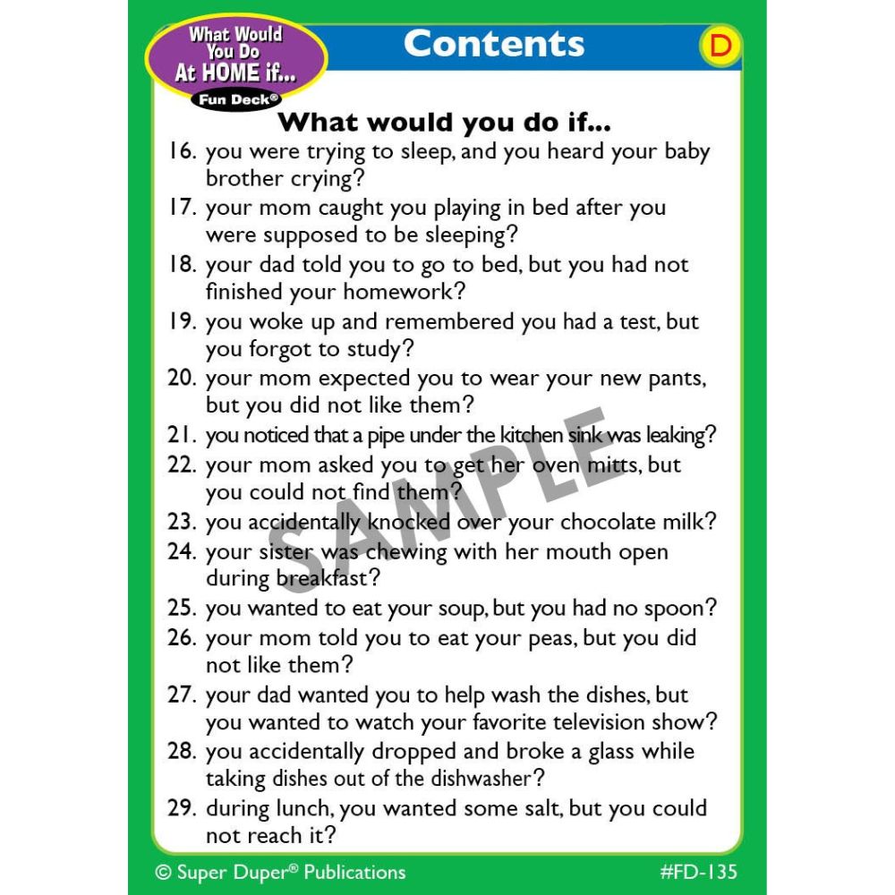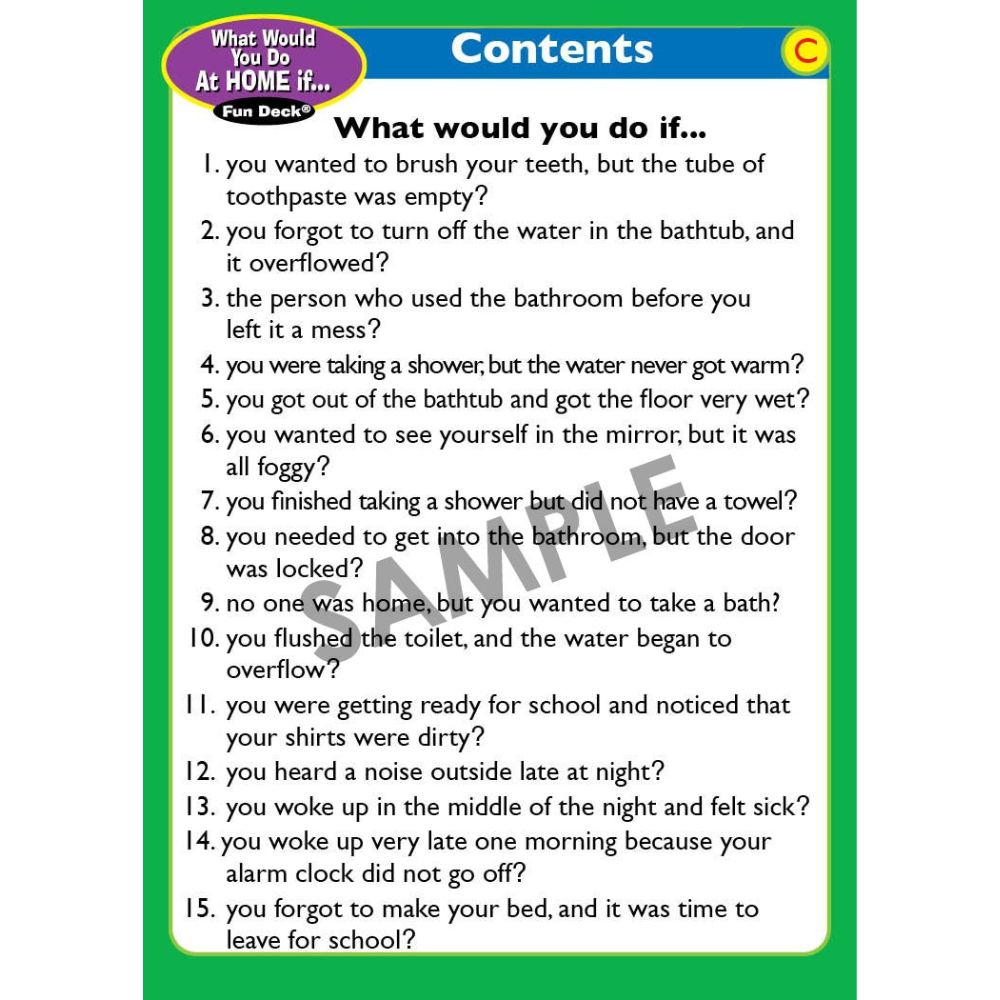 The What Would You Do At Home If… Fun Deck teaches students how to solve problems, understand cause/effect relationships, and practice good social skills. Each card has a colourful illustration depicting a "What would you do at home if..." question. Students then discuss and/or write about what they would do in that specific situation. This Fun Deck includes four content/game ideas to help jump-start learning.
