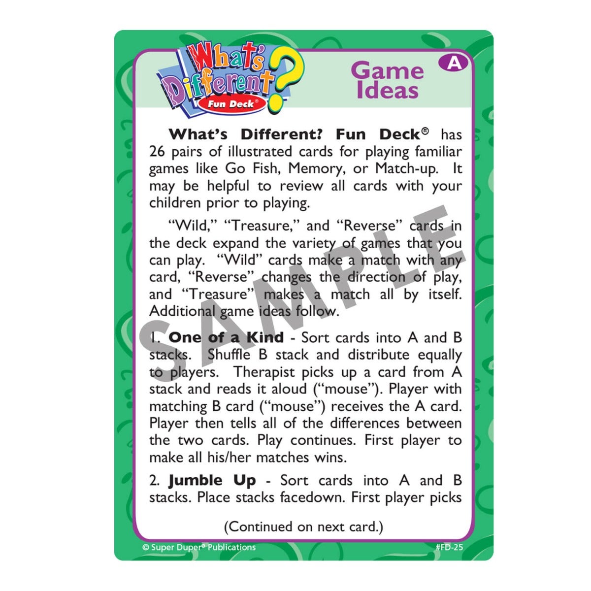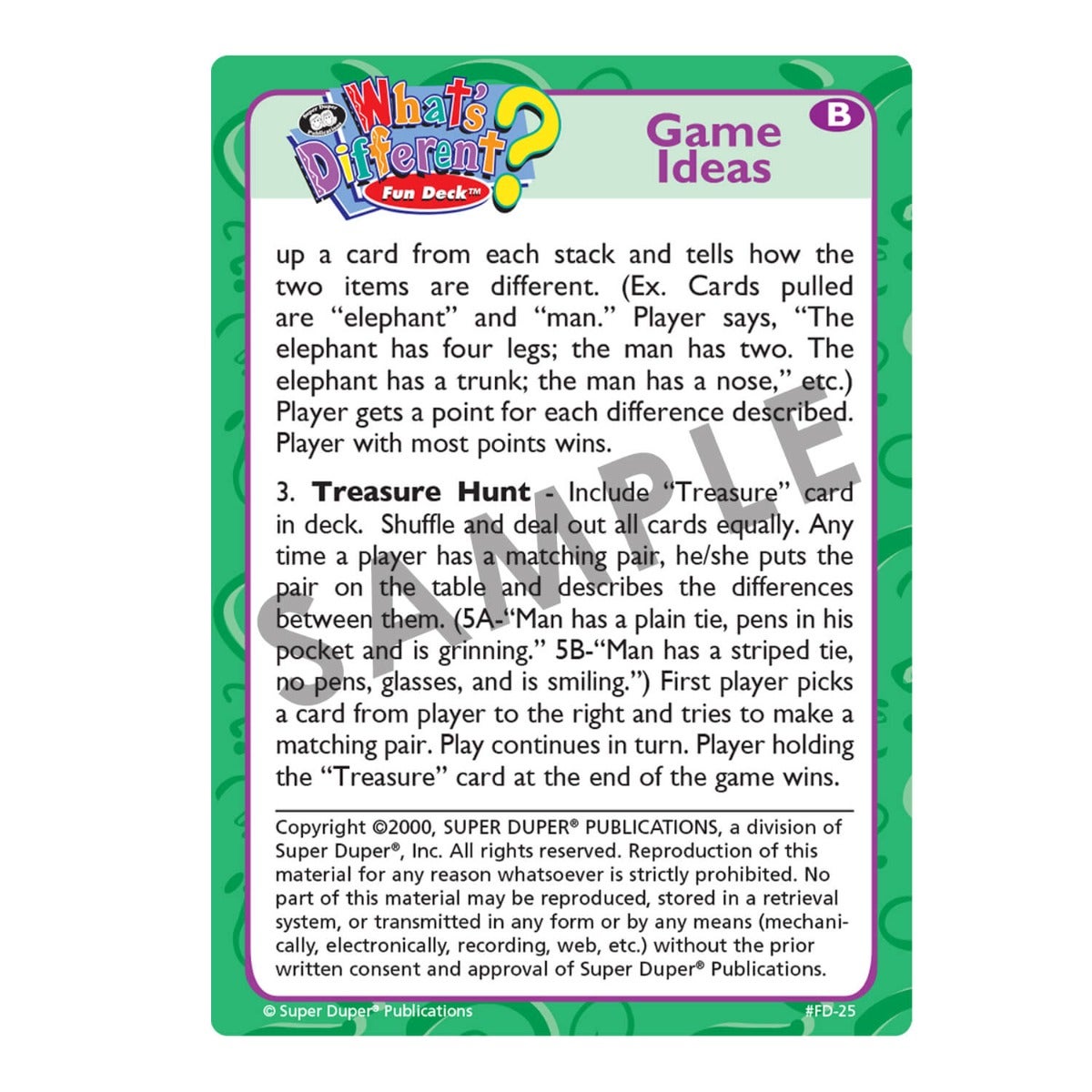 The What's Different? Fun Deck® 56-card deck has 26 match-up pairs of pictures with minimal to obvious differences, which will help kids build visual discrimination skills.