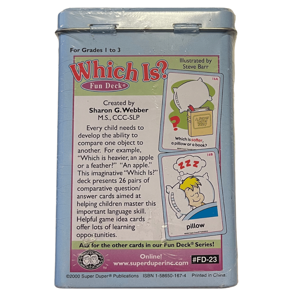 This imaginative "Which Is?" deck presents 26 pairs of comparative question/answer cards aimed at helping children master this important language skill.